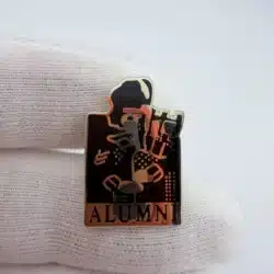 This striking black lapel pin features silver tone highlights, prominently displaying a bagpiper at the top with the word ‘alumni’ elegantly positioned below. The design reflects a connection to collegiate traditions and the cultural significance of bagpiping in various educational institutions.