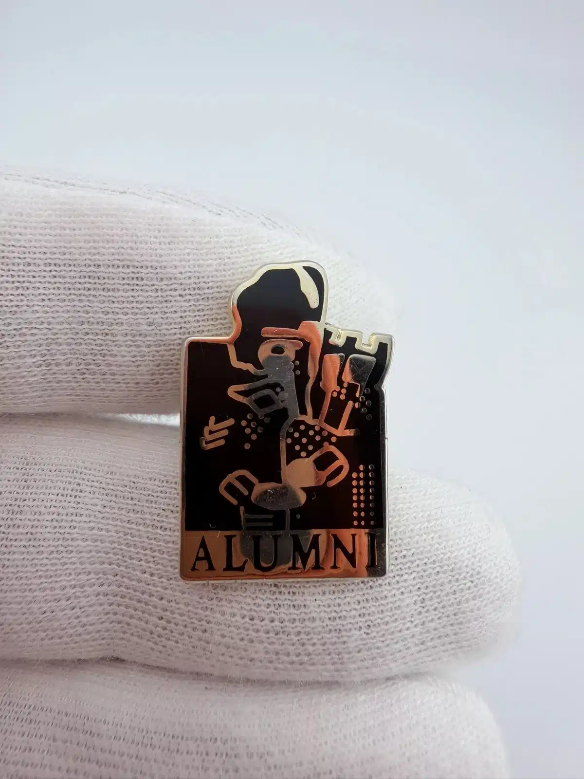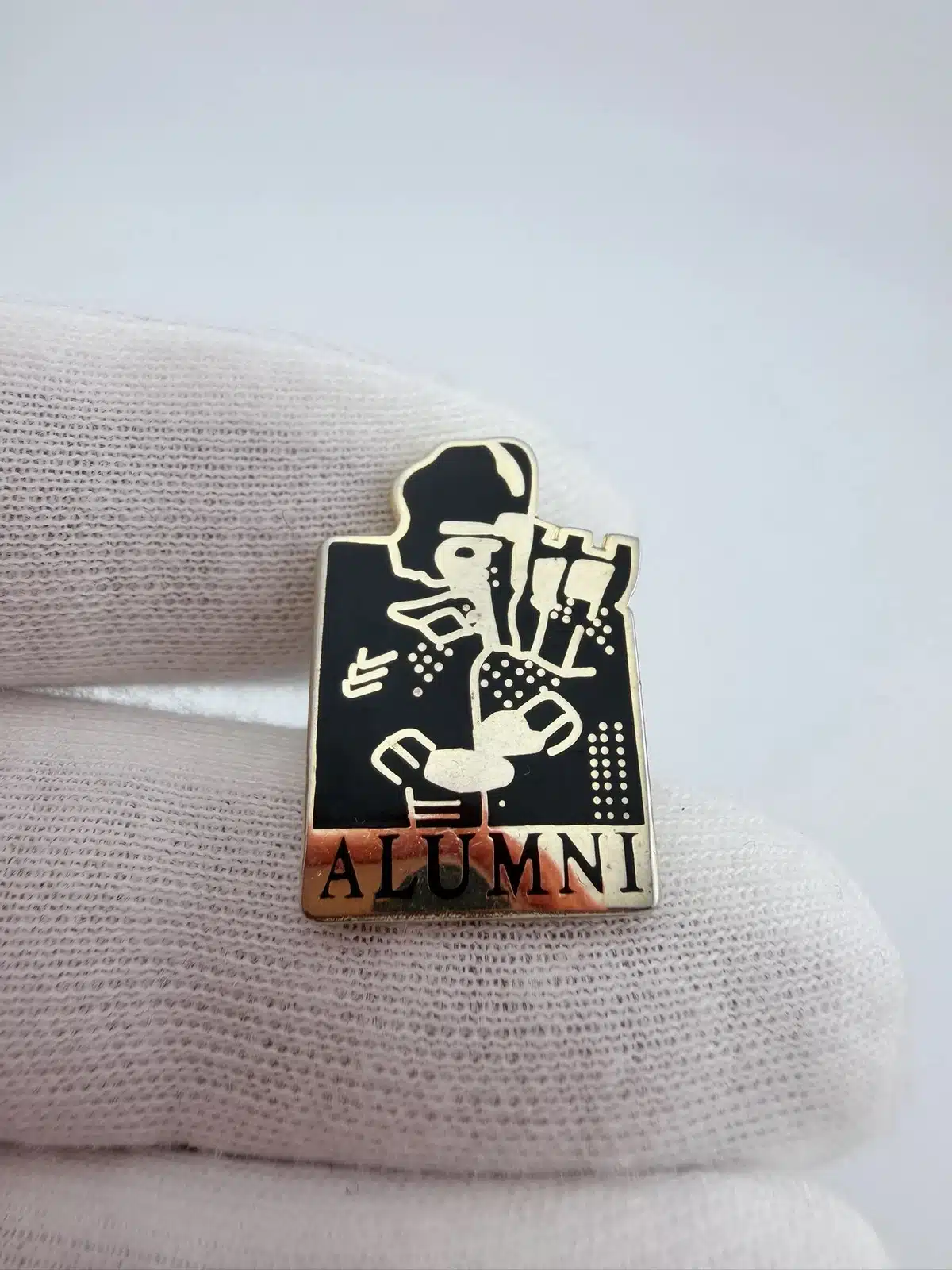 This striking black lapel pin features silver tone highlights, prominently displaying a bagpiper at the top with the word ‘alumni’ elegantly positioned below. The design reflects a connection to collegiate traditions and the cultural significance of bagpiping in various educational institutions.