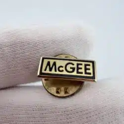 This gold tone pin features a clean rectangular design with black highlights that create strong contrast against the polished metal finish. The brand ‘McGEE’ appears across the front in bold black lettering, giving the piece a crisp and easily readable presentation.