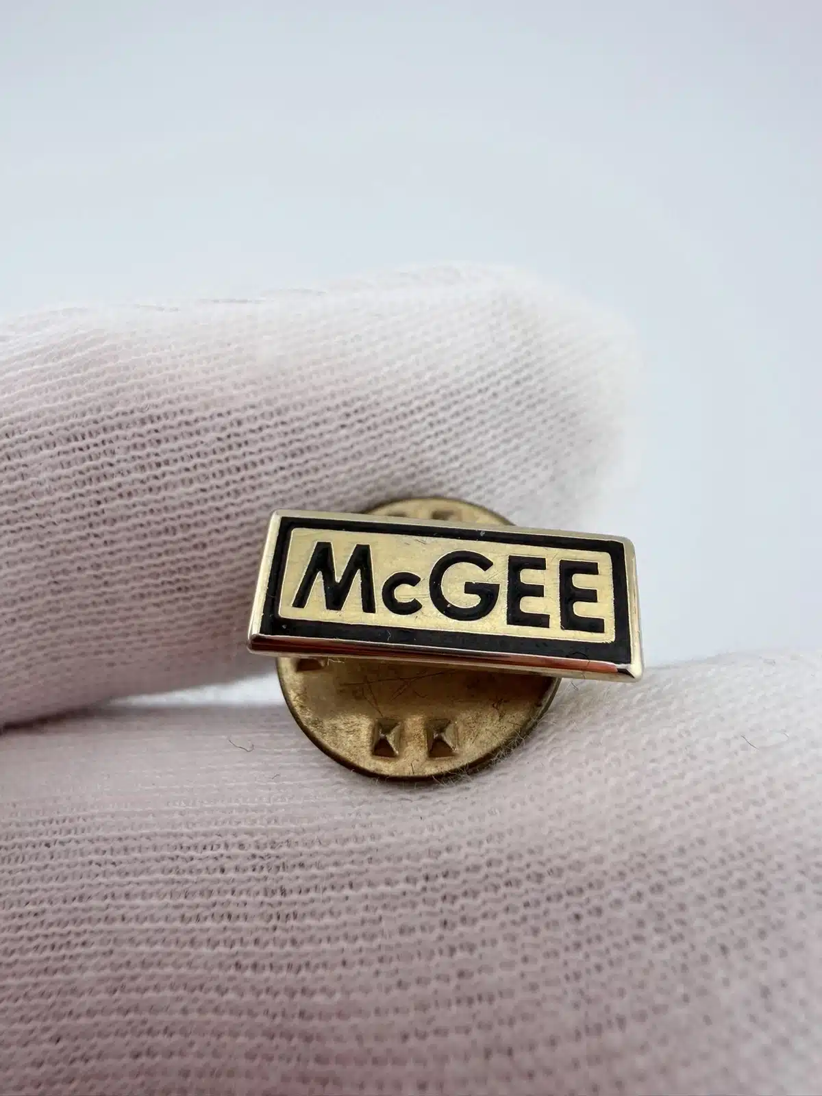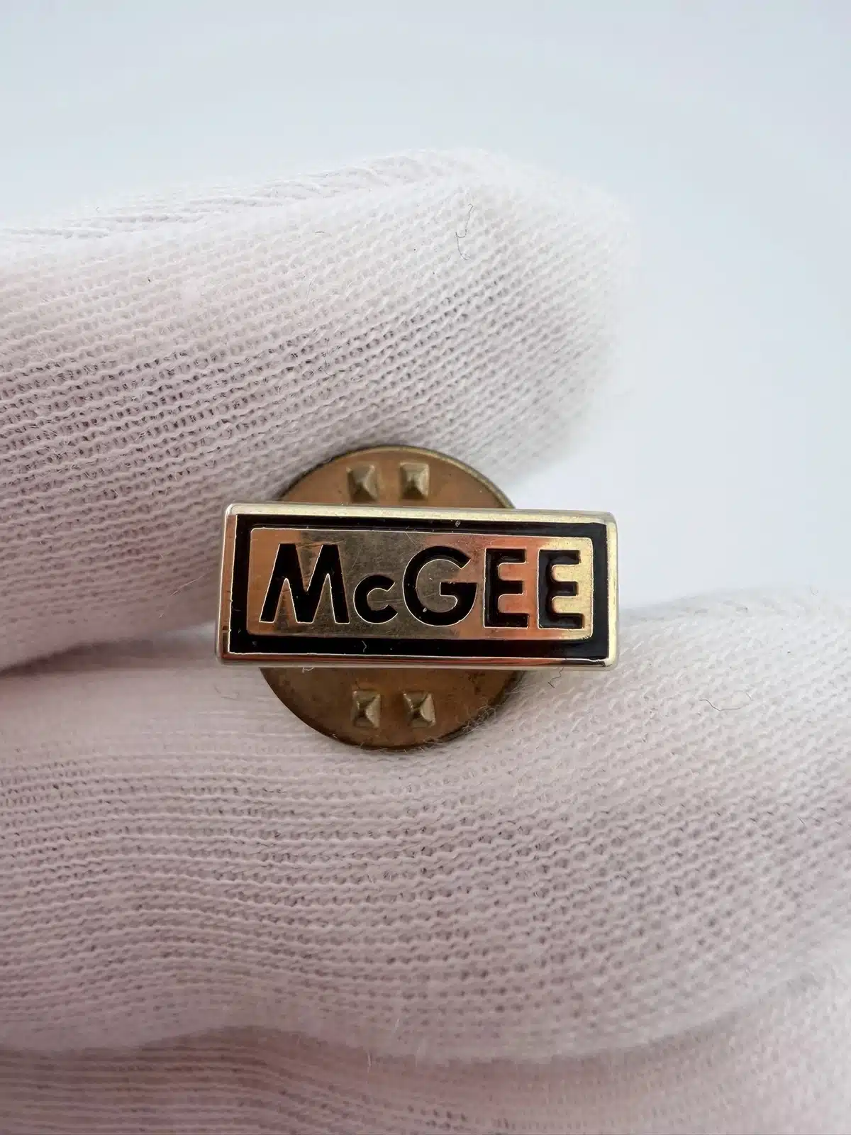This gold tone pin features a clean rectangular design with black highlights that create strong contrast against the polished metal finish. The brand ‘McGEE’ appears across the front in bold black lettering, giving the piece a crisp and easily readable presentation.