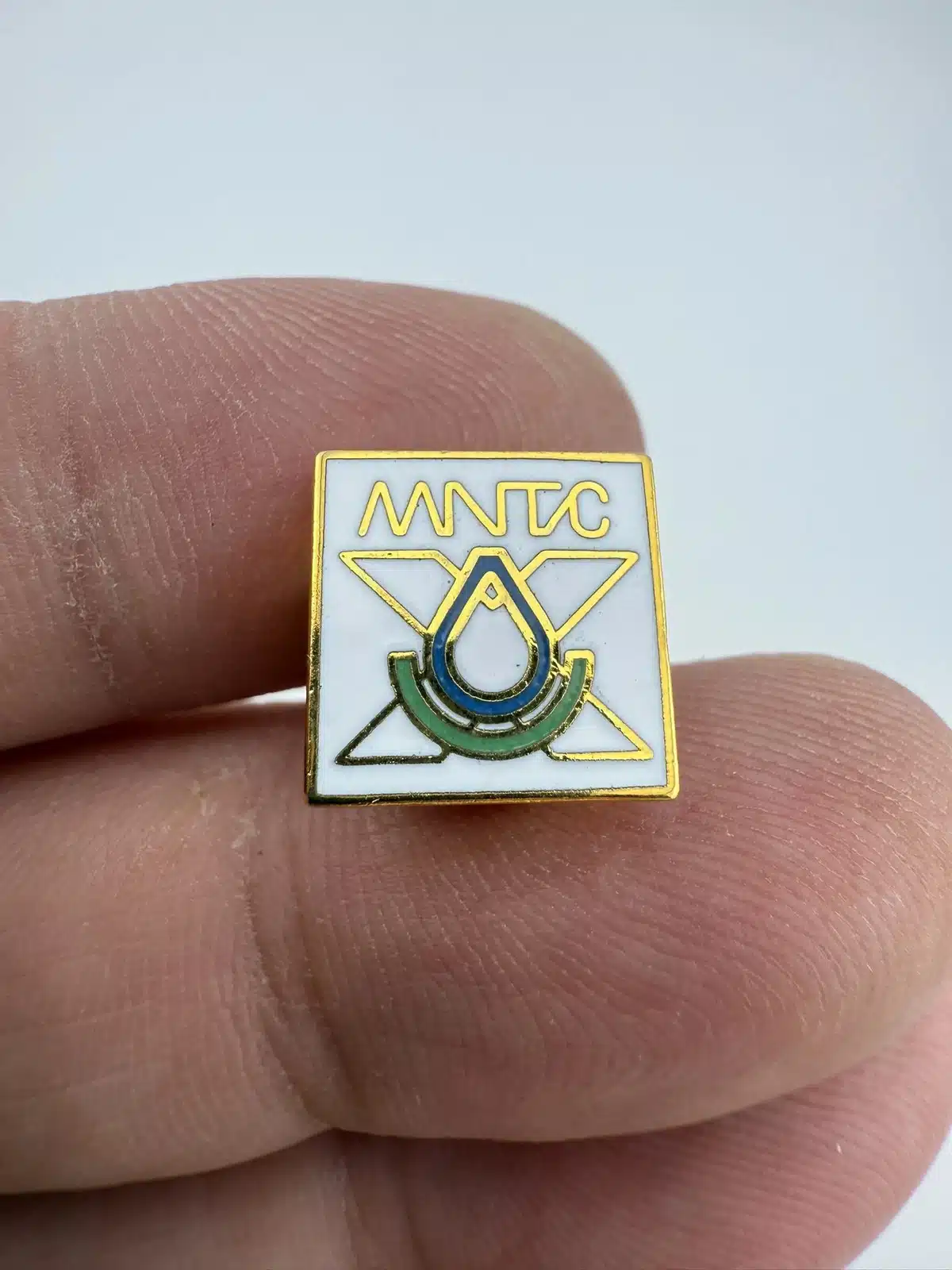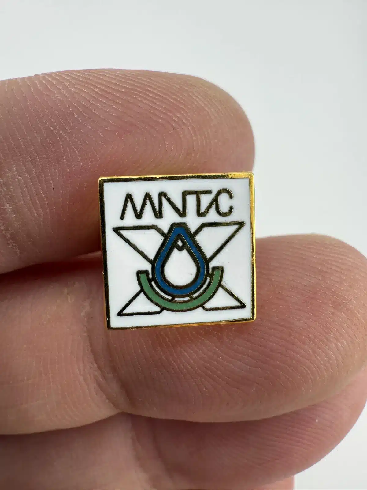 Unknown MNTC lapel hat pin – possibly from Moore Norman Technology Center. Also features the letter X and possibly a droplet of water.