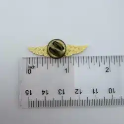 Measuring approximately 1.5 inches in width and just over .25 inches in height, the pin has a sleek, low profile shape that sits nicely on a jacket, hat, or display board. The gold tone finish gives it a polished appearance while maintaining a subtle, professional look.