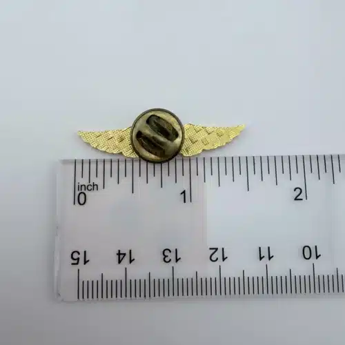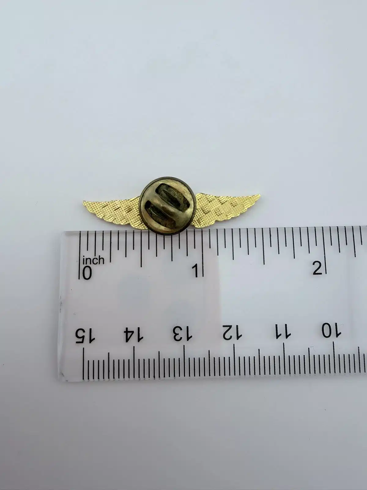 Measuring approximately 1.5 inches in width and just over .25 inches in height, the pin has a sleek, low profile shape that sits nicely on a jacket, hat, or display board. The gold tone finish gives it a polished appearance while maintaining a subtle, professional look.