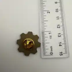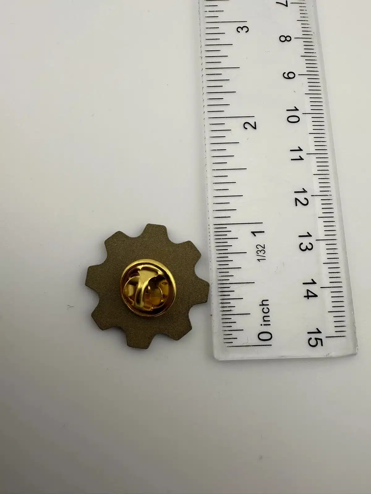 Unknown lapel pin, approximately an inch in size, that features a gear / cog shape along with a globe in the center.