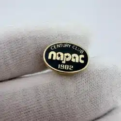 This vintage 1982 NAPAC Century Club tie tack pin features an oval shape with the words ‘CENTURY CLUB’ prominently displayed at the top, ‘NAPAC’ in the center, and ‘1982’ at the bottom. Unknown reference.