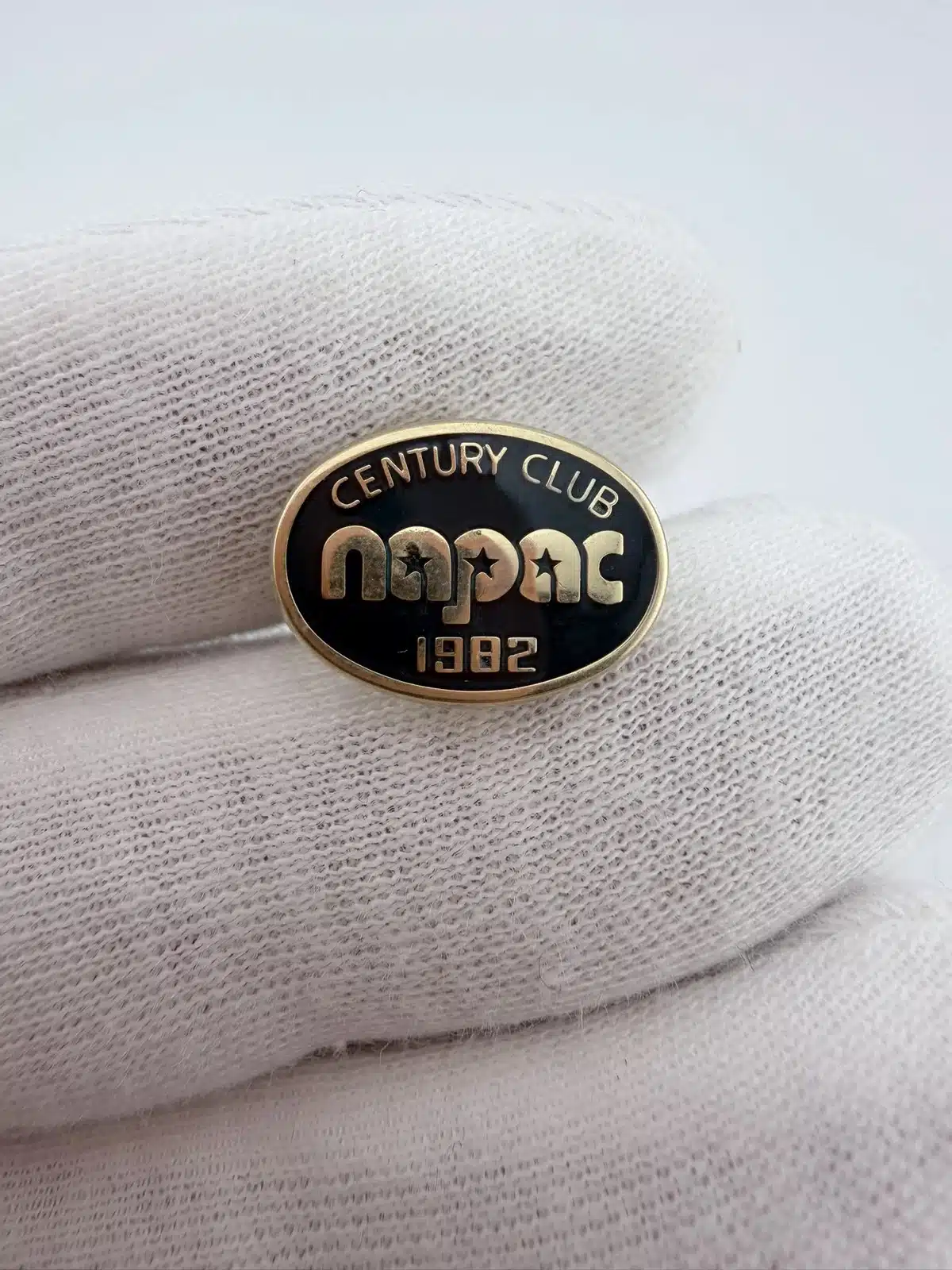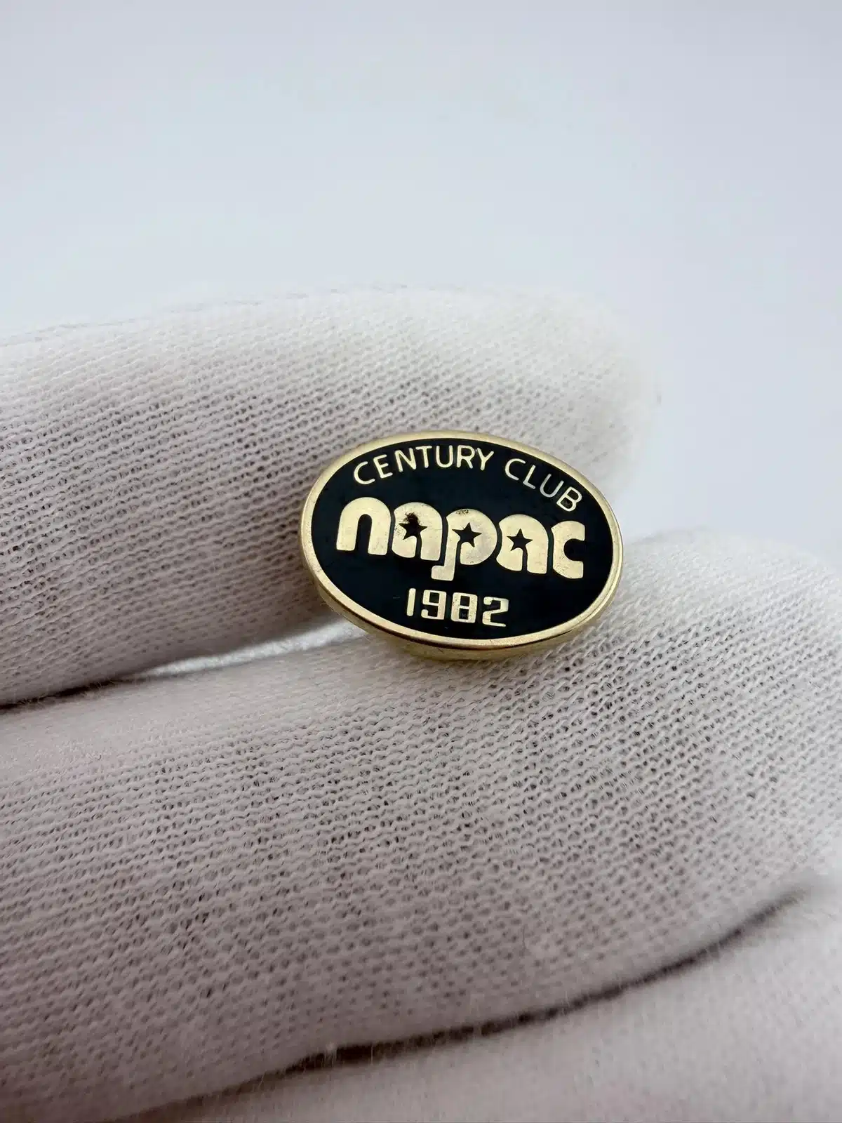 This vintage 1982 NAPAC Century Club tie tack pin features an oval shape with the words ‘CENTURY CLUB’ prominently displayed at the top, ‘NAPAC’ in the center, and ‘1982’ at the bottom. Unknown reference.