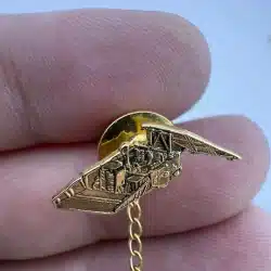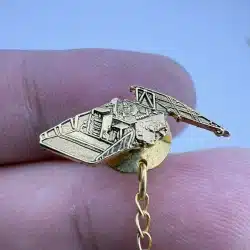 I believe this is a satellite in the process of unfolding, but I cannot be sure. If you know send me a message! This vintage tie tack pin features a gold-tone design resembling a satellite, capturing the essence of mid-20th century space exploration. The pin reflects the era’s fascination with technology and the burgeoning interest in outer space, symbolizing a significant period in scientific advancement.