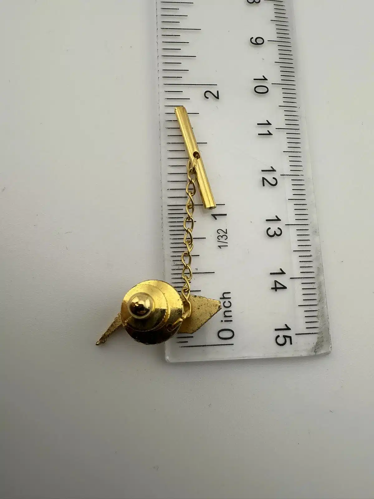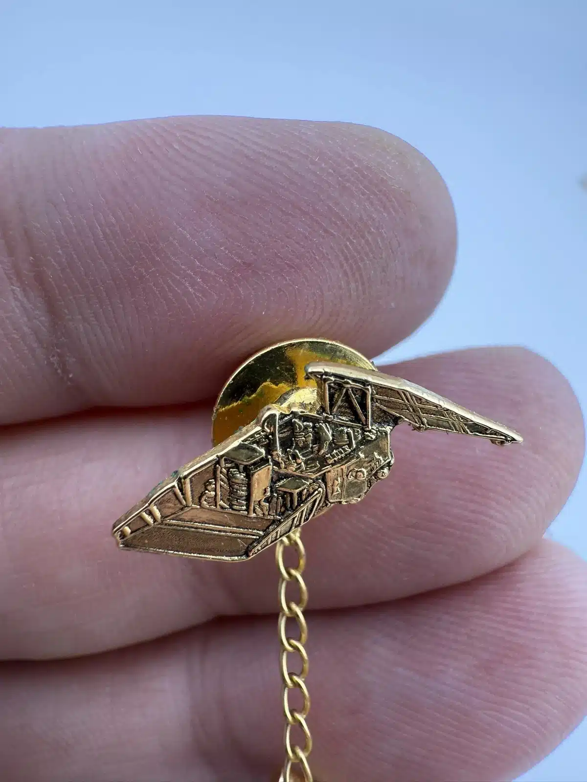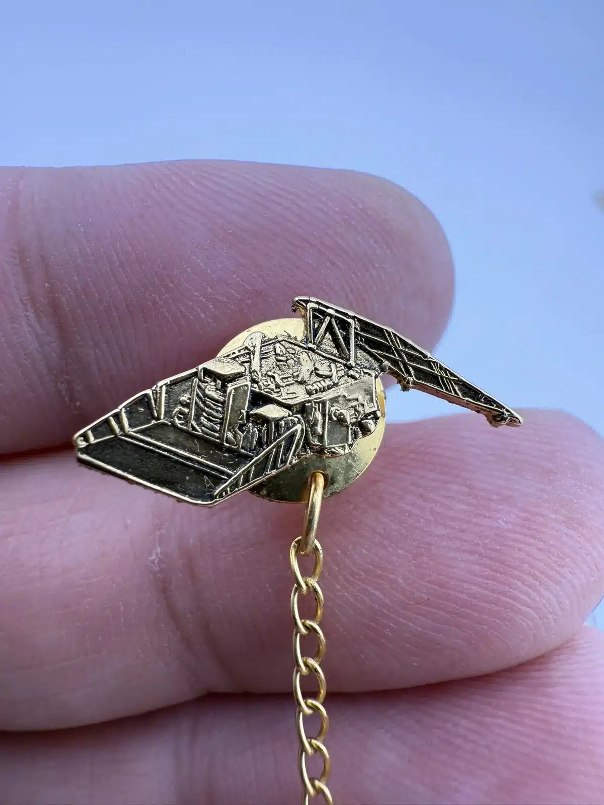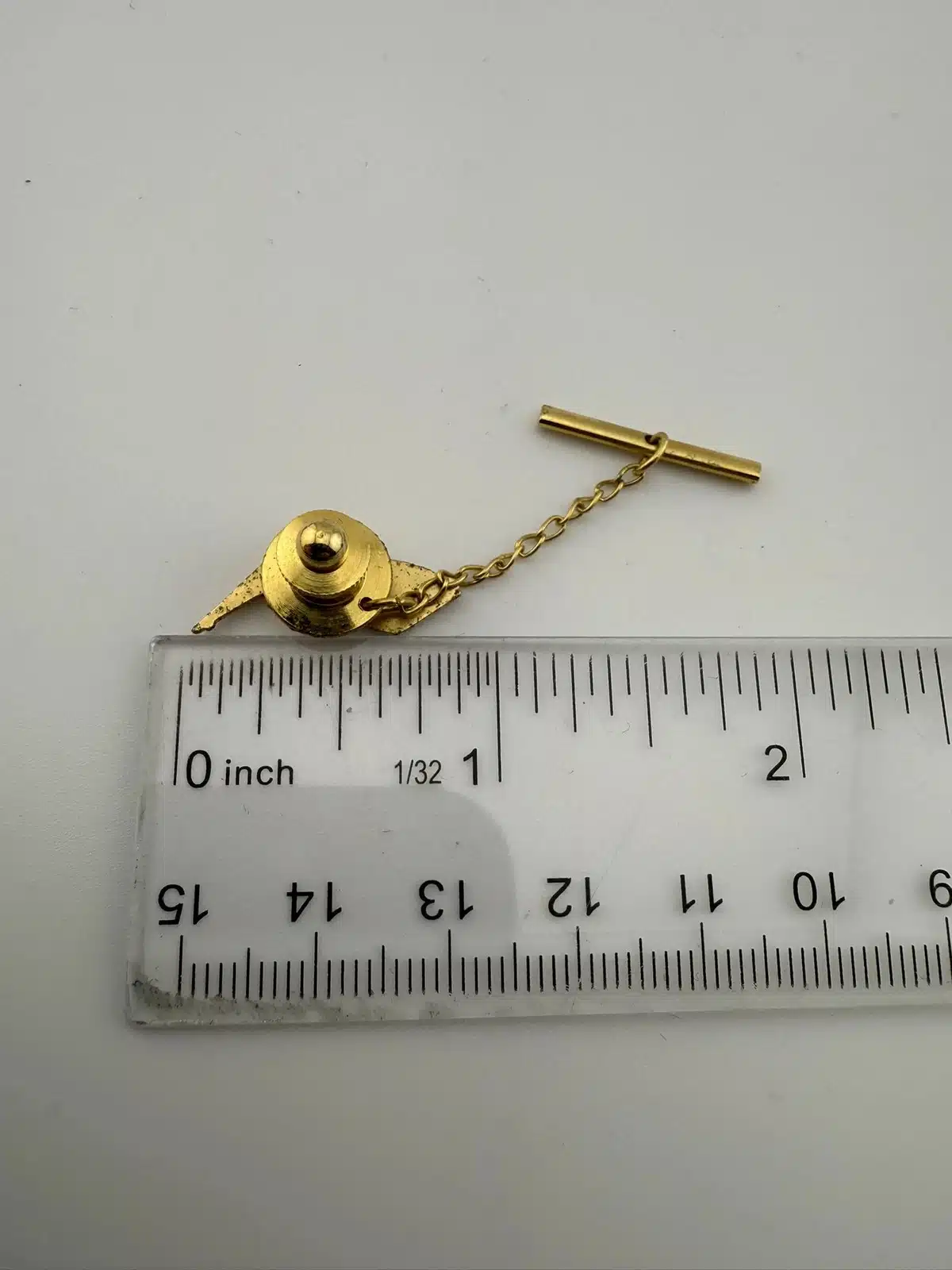 I believe this is a satellite in the process of unfolding, but I cannot be sure. If you know send me a message! This vintage tie tack pin features a gold-tone design resembling a satellite, capturing the essence of mid-20th century space exploration. The pin reflects the era’s fascination with technology and the burgeoning interest in outer space, symbolizing a significant period in scientific advancement.