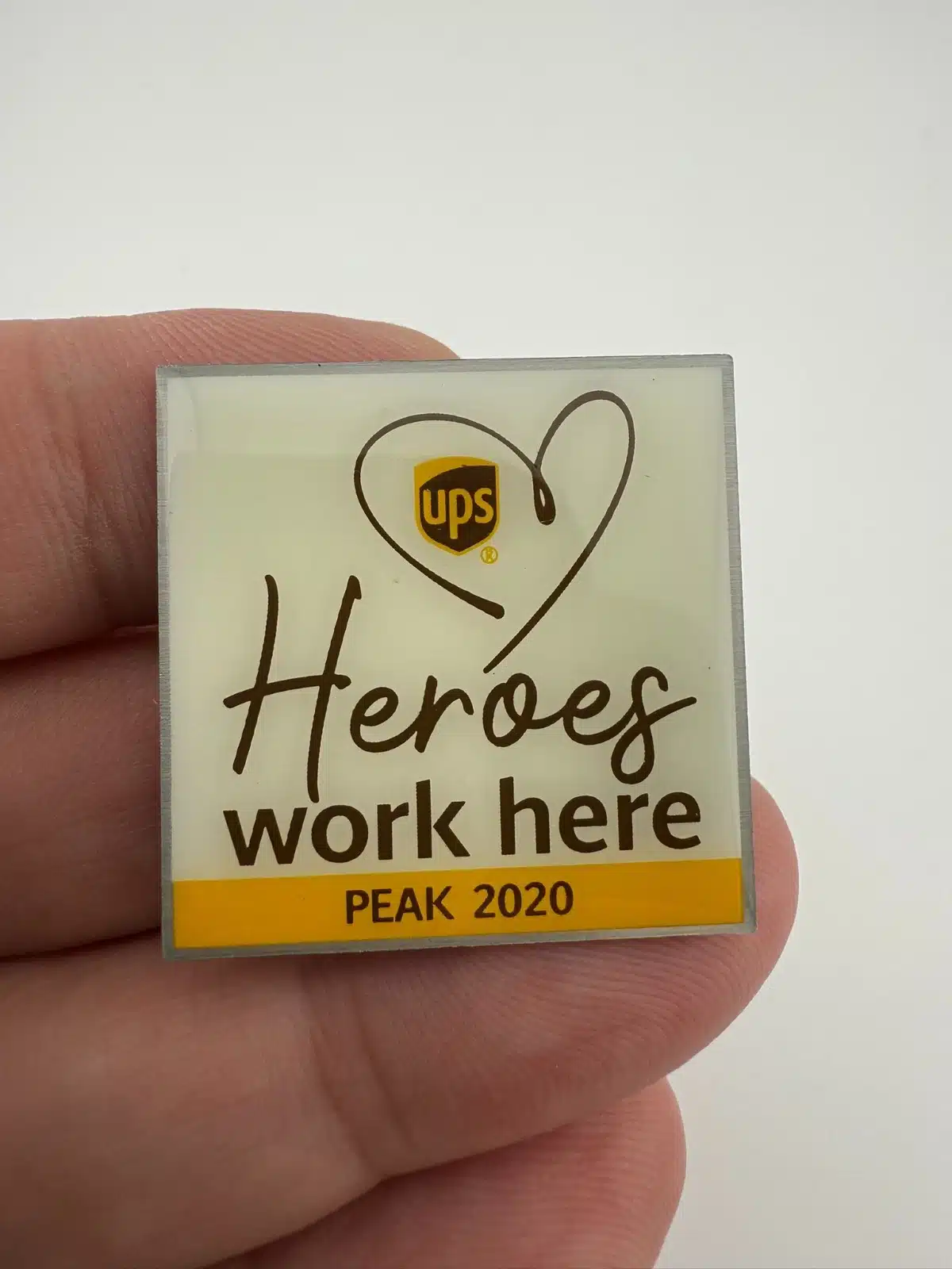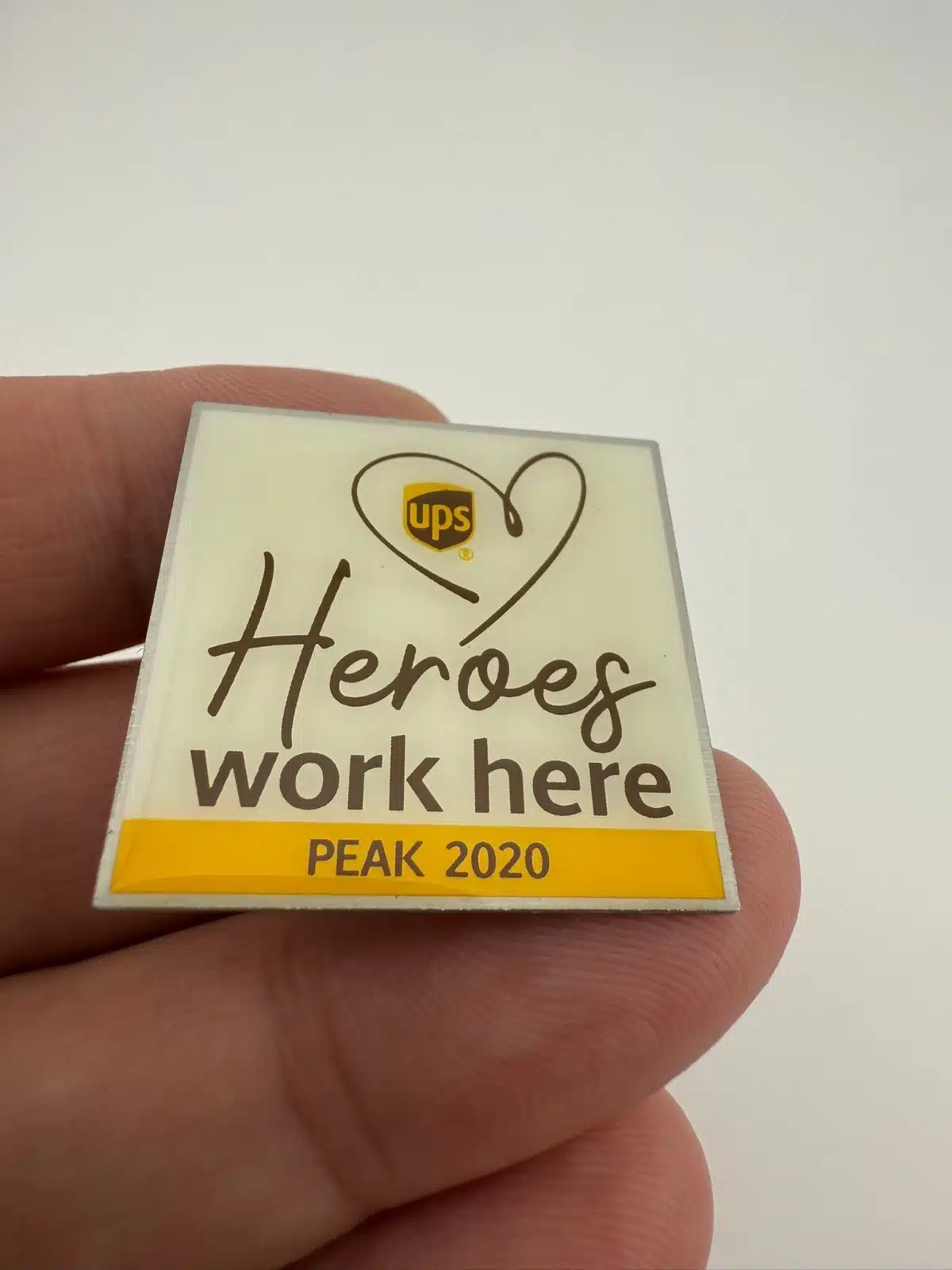 The UPS Heroes Work Here Peak 2020 Pin honors UPS employees for their dedication during the 2020 COVID-19 pandemic.