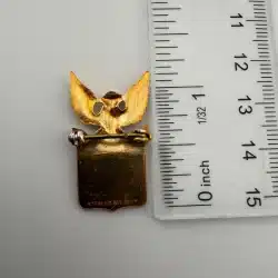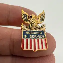 Husband In Service pins were worn during periods of U.S. military conflict to signify that a spouse was actively serving, often incorporating patriotic symbols like the eagle and flag elements. The piece has a sterling silver base and measures just under 3/4 inch in width by just over 1 inch in height.