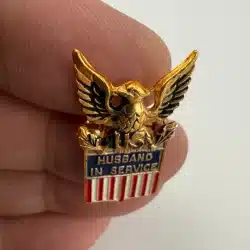 Gold tone pin featuring an eagle with wings spread, holding arrows in one talon and an olive branch in the other, with the letters US positioned across the center of the eagle’s body. Below the figure is the phrase Husband In Service, followed by a vertically striped red and white design, all set on a sterling silver base.