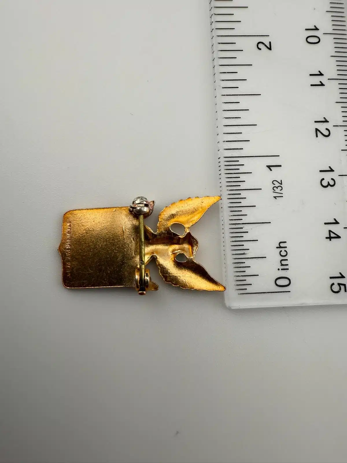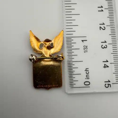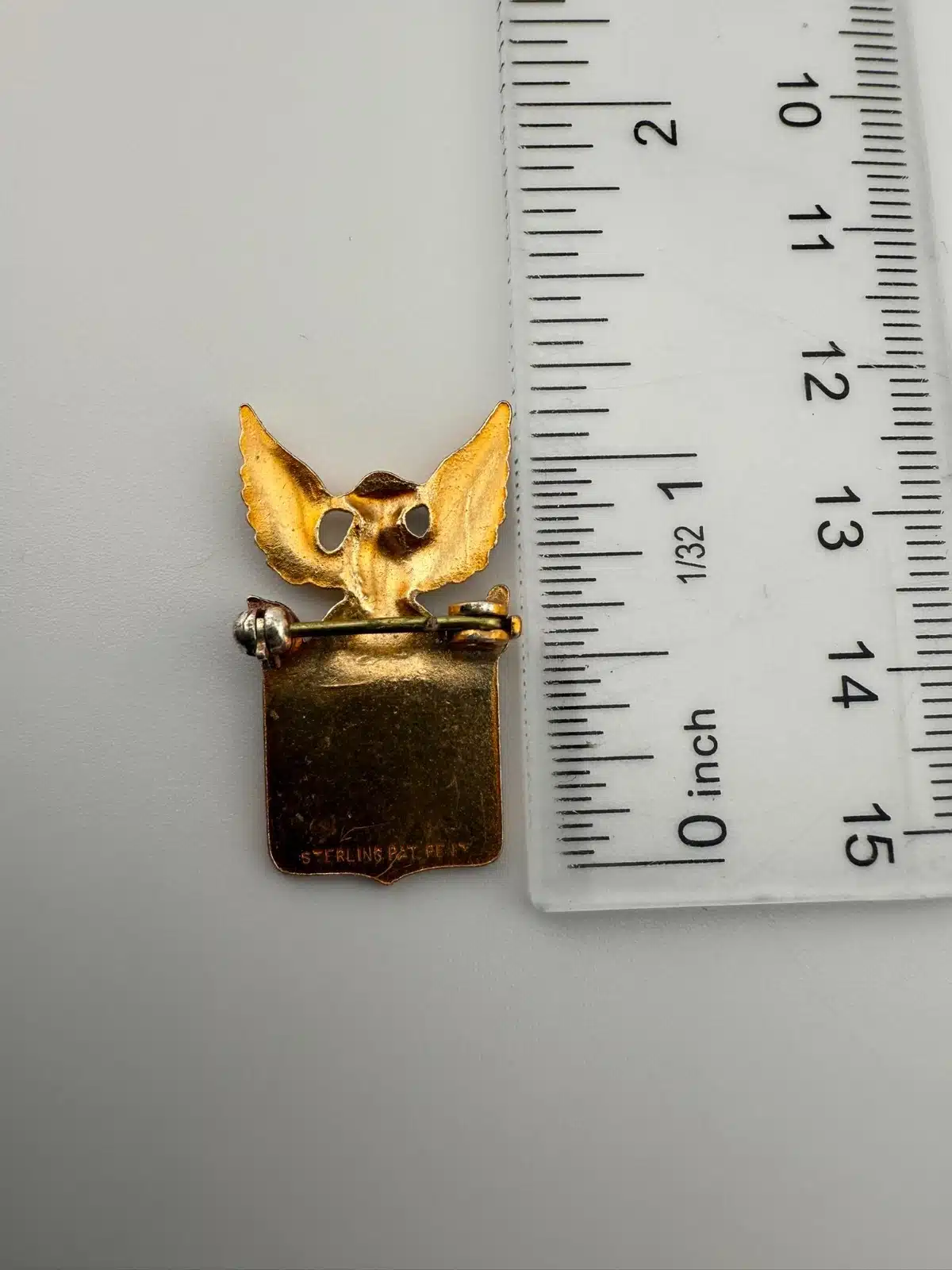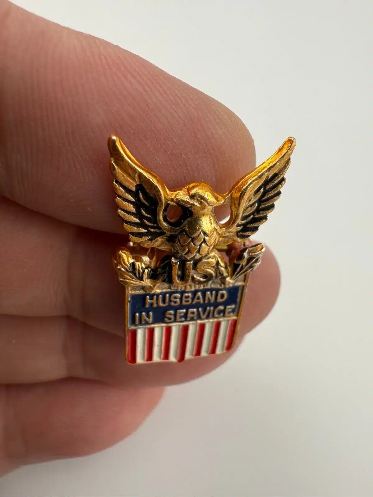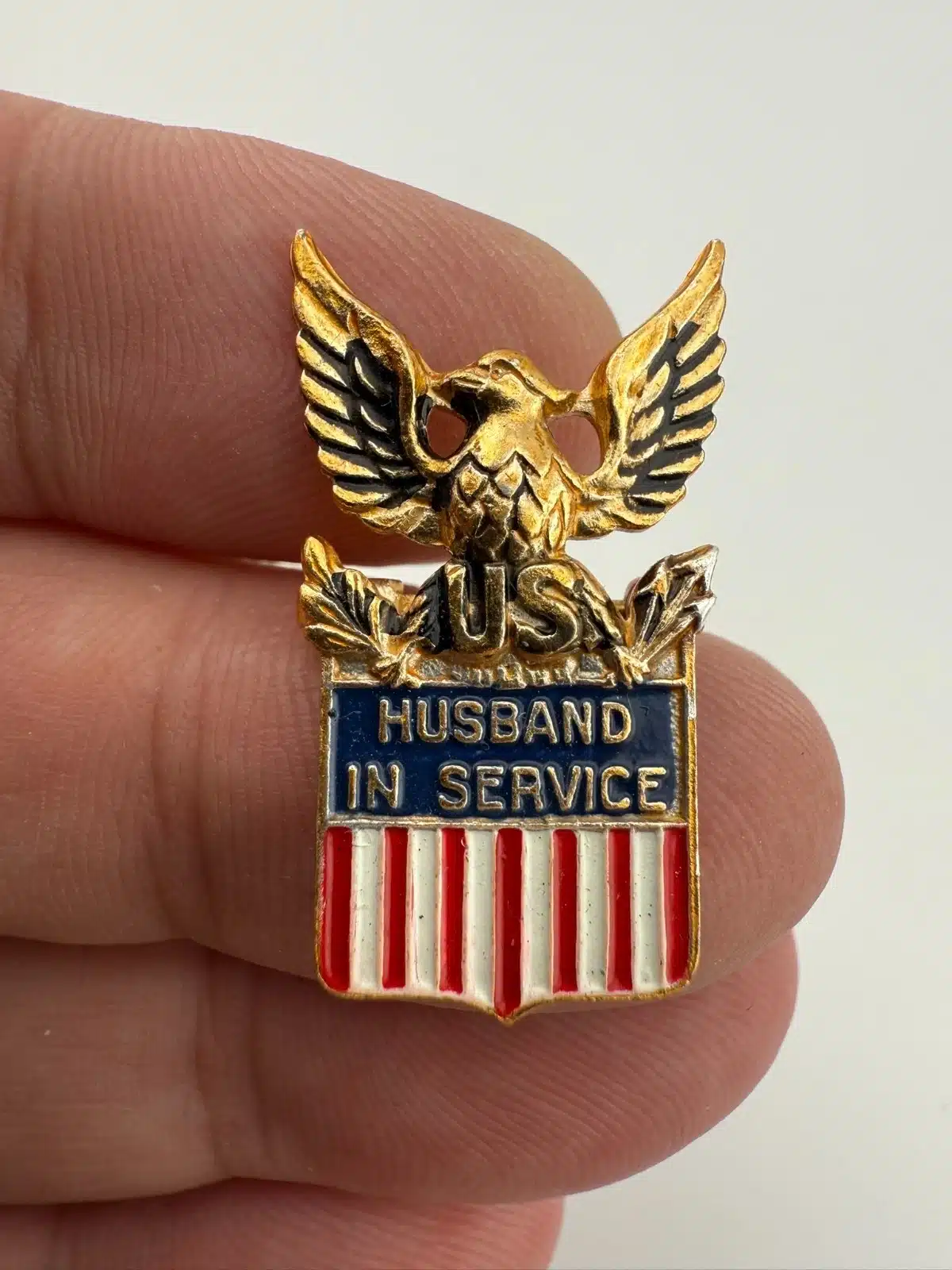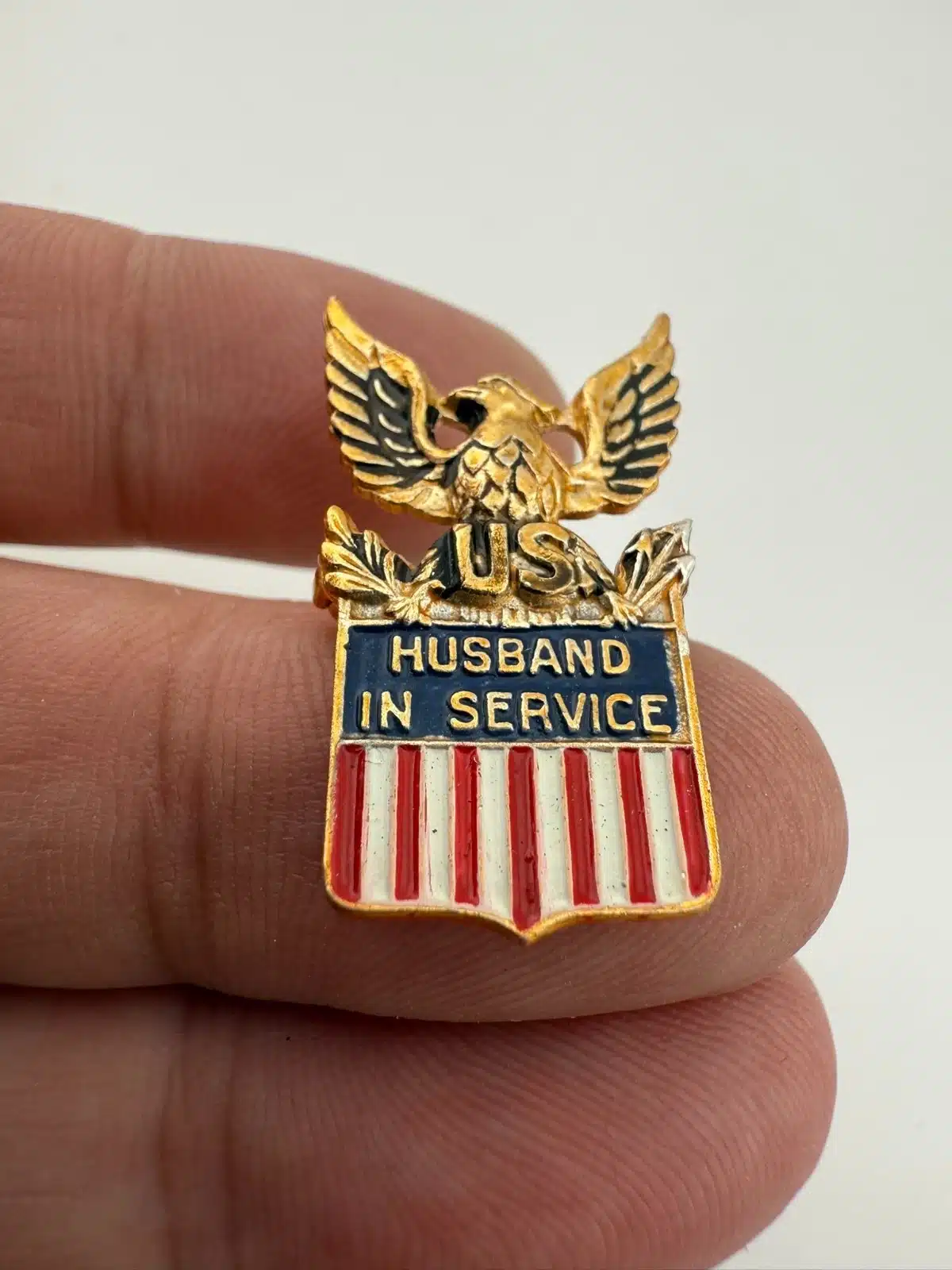 Husband In Service pins were worn during periods of U.S. military conflict to signify that a spouse was actively serving, often incorporating patriotic symbols like the eagle and flag elements. The piece has a sterling silver base and measures just under 3/4 inch in width by just over 1 inch in height.