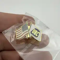 This lapel pin features the USA flag crossed with the the flag of the United Brotherhood of Carpenters, symbolizing the union’s commitment to American workers. The design incorporates vibrant colors and intricate details that represent both national pride and solidarity within the carpentry profession.