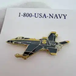 This lapel pin features a striking blue and yellow fighter jet design, prominently displaying the number ‘8’ on its side, representing the U.S. Navy’s Blue Angels demonstration squadron. The Blue Angels, established in 1946, are renowned for their precision flying and aerial acrobatics, showcasing the capabilities of naval aviation.