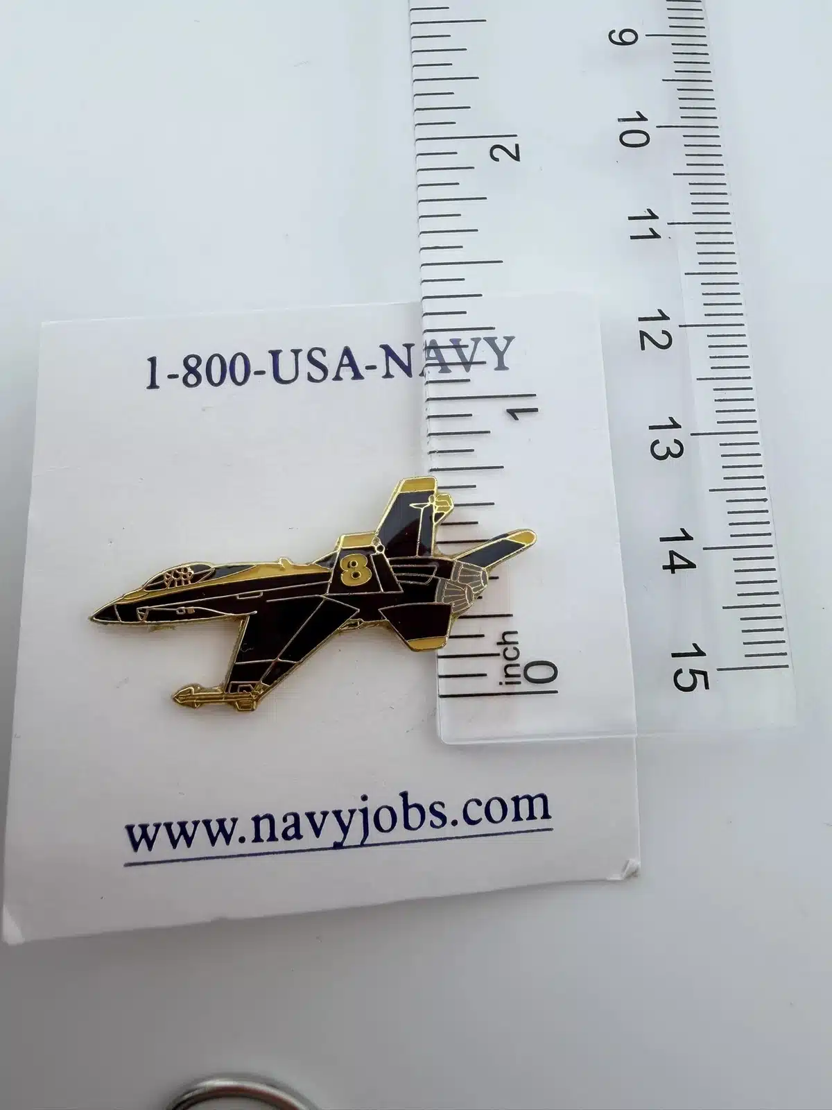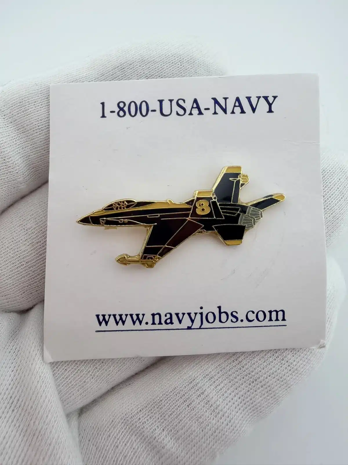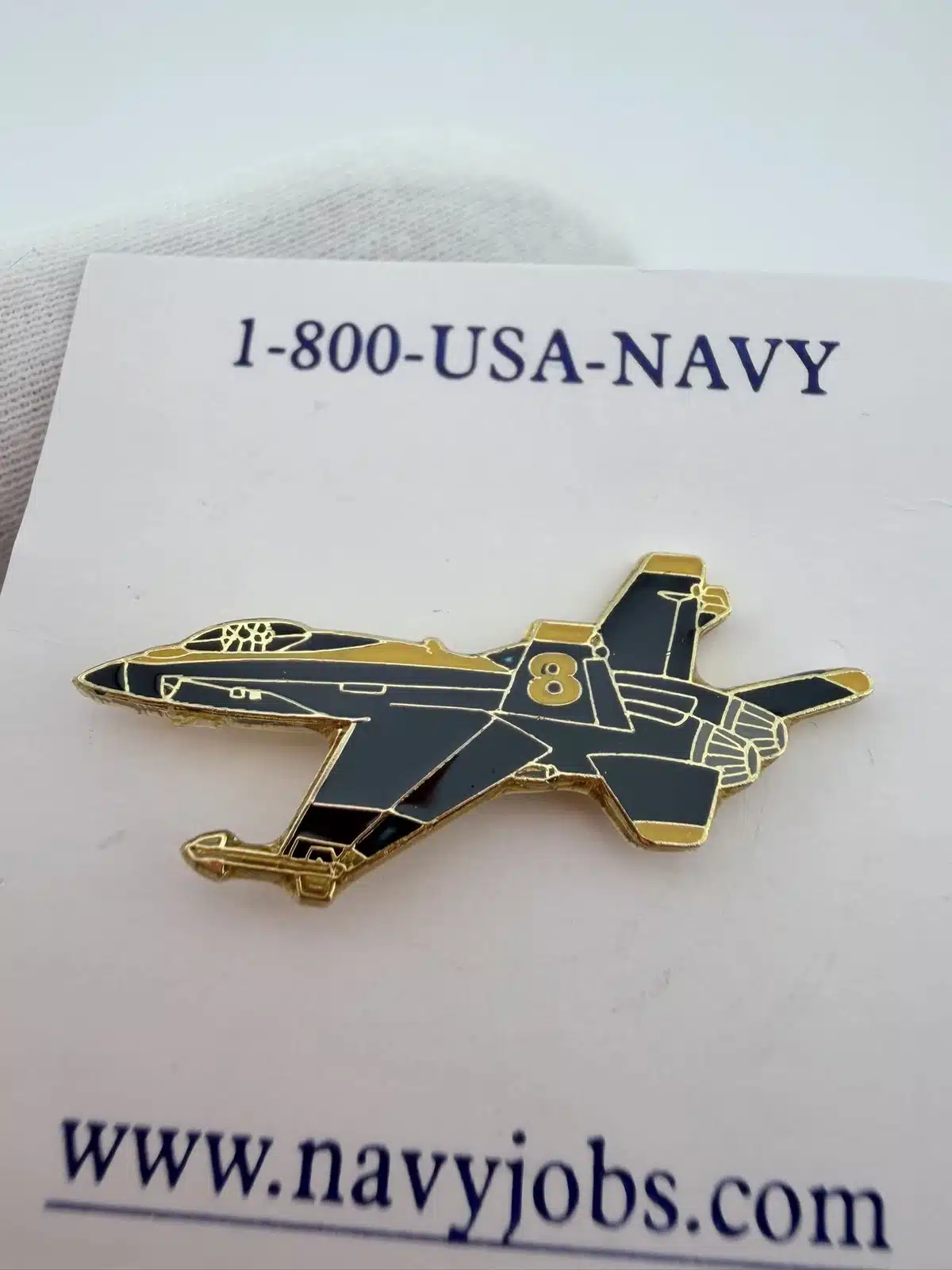This lapel pin features a striking blue and yellow fighter jet design, prominently displaying the number ‘8’ on its side, representing the U.S. Navy’s Blue Angels demonstration squadron. The Blue Angels, established in 1946, are renowned for their precision flying and aerial acrobatics, showcasing the capabilities of naval aviation.