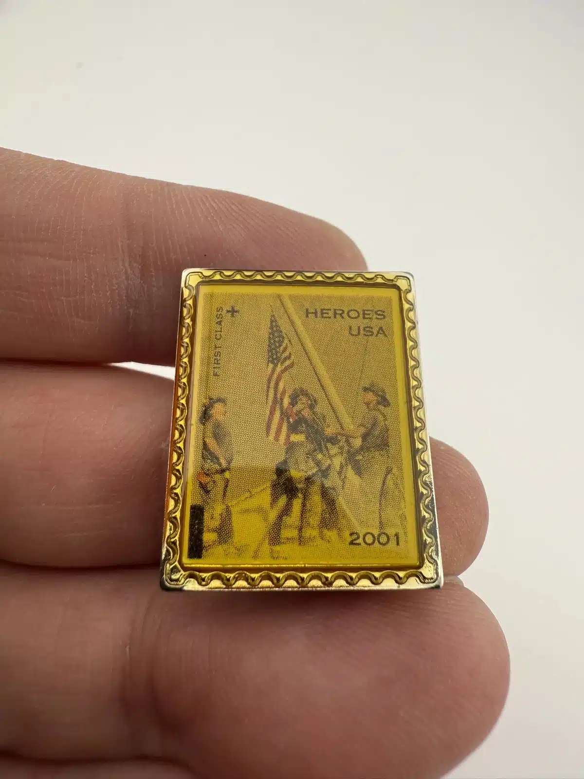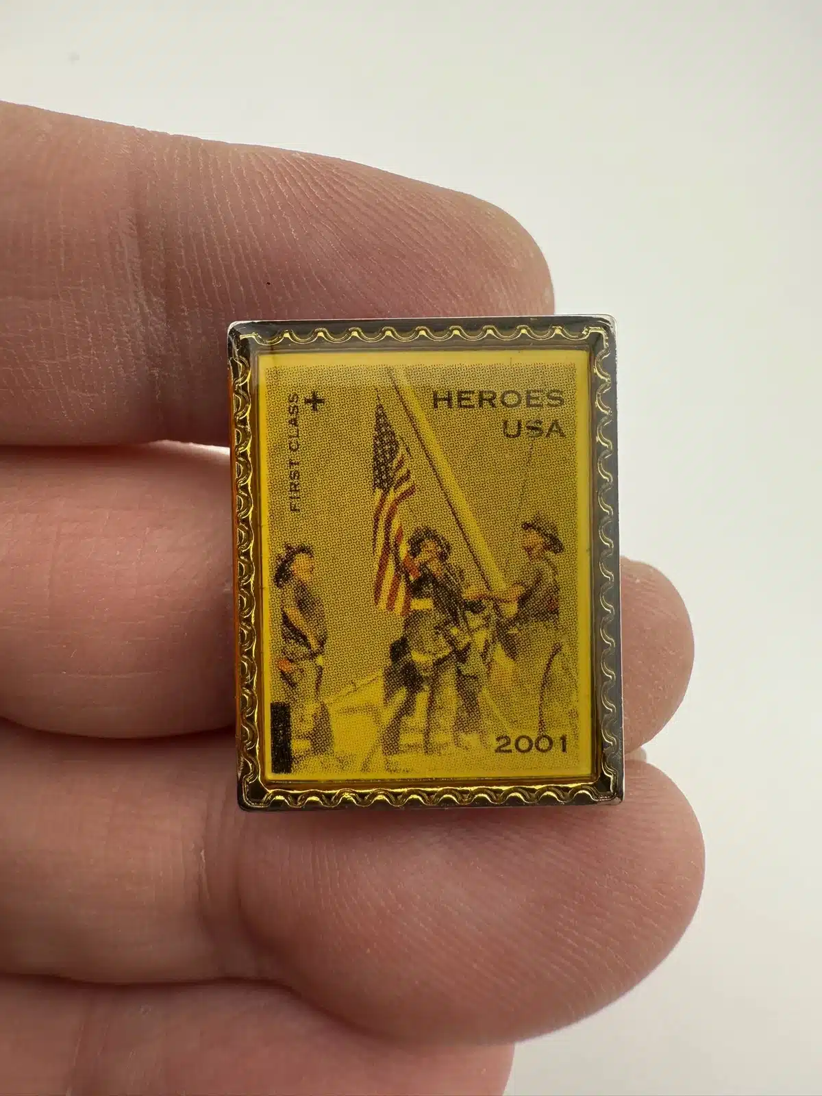 This pin features the iconic image of firefighters raising the American flag at Ground Zero, symbolizing resilience and unity following the tragic events of September 11, 2001. The design commemorates the USPS Heroes stamp series, which honors the bravery of first responders during this pivotal moment in American history.