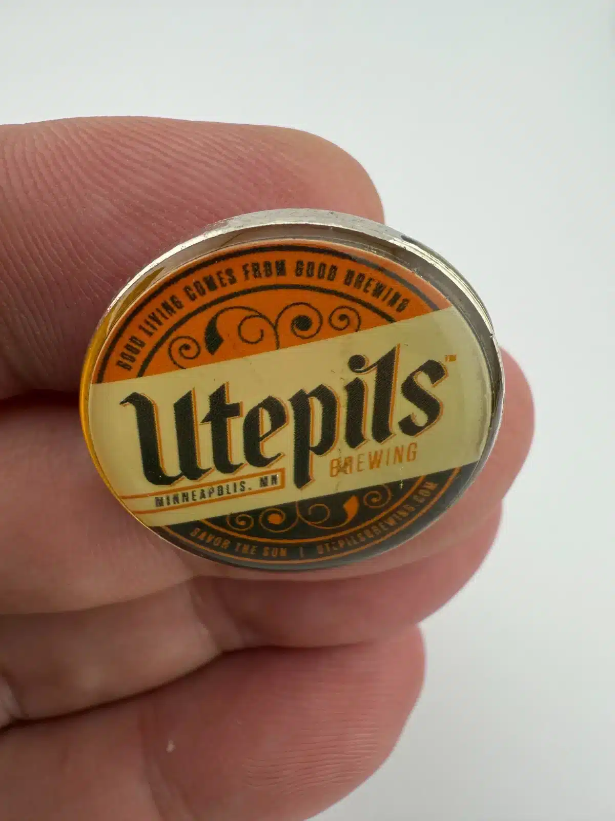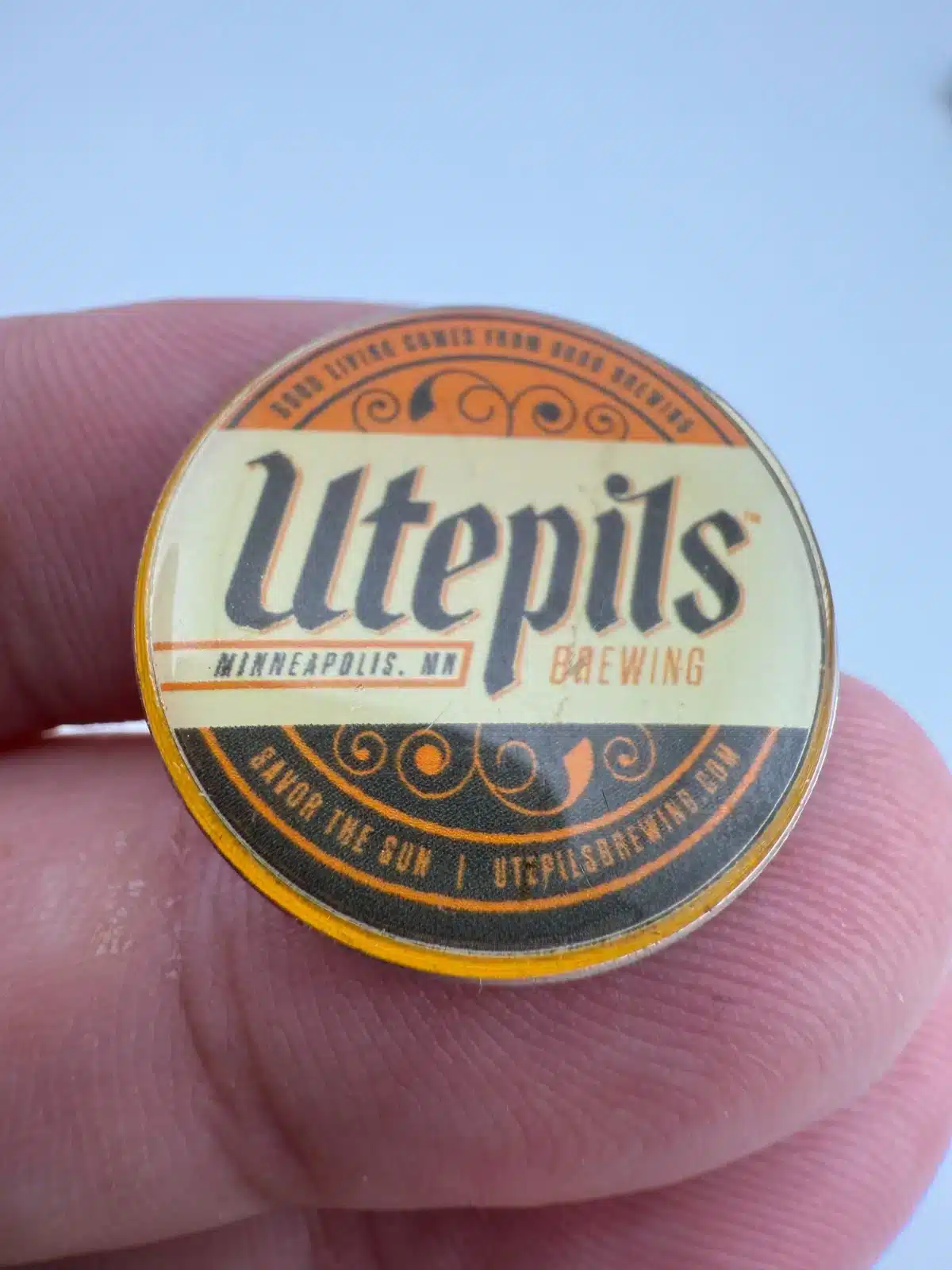 Utepils Brewing is a craft brewery based in Minneapolis, Minnesota known for traditional European-style lagers and its outdoor beer garden culture. Pin measures approximately 1 inch in width by 1 inch in height.