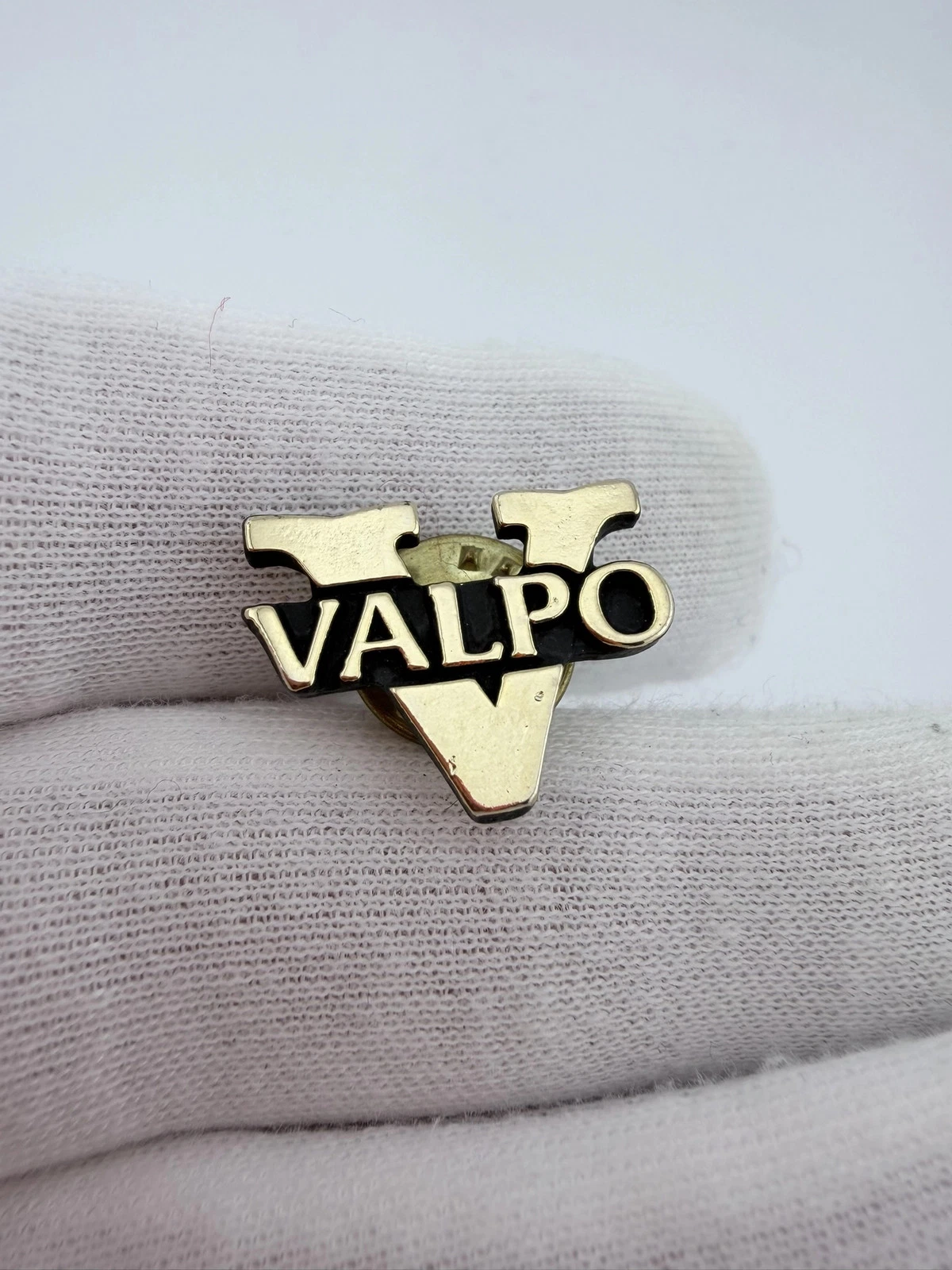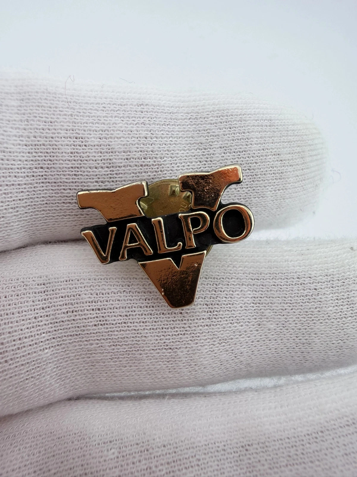 This pin features a bold gold tone letter “V” with the word “VALPO” running vertically across the center of the letter.