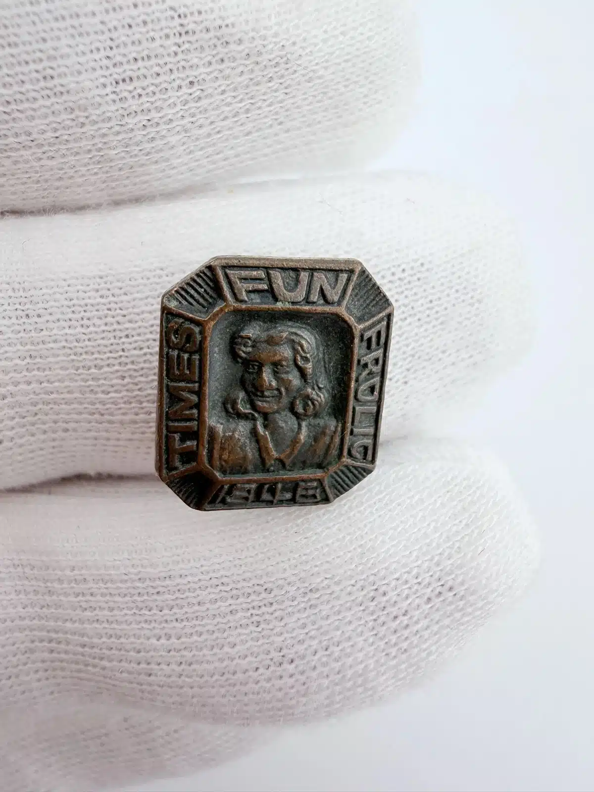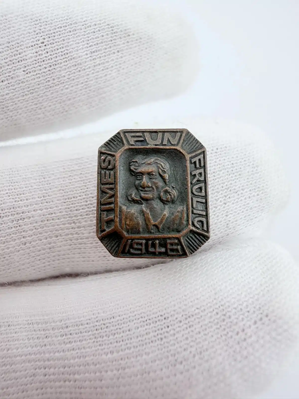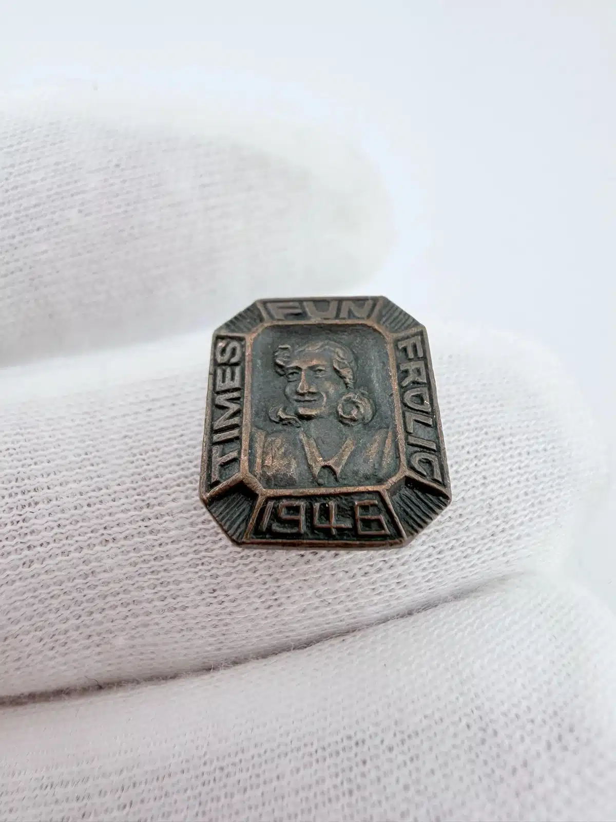 This vintage 1946 pin brooch features a whimsical design inspired by the Fun Frolic event hosted by the Seattle Times, showcasing playful imagery that reflects the spirit of post-war celebration. The piece serves as a charming reminder of the vibrant social culture of Seattle during the mid-20th century.