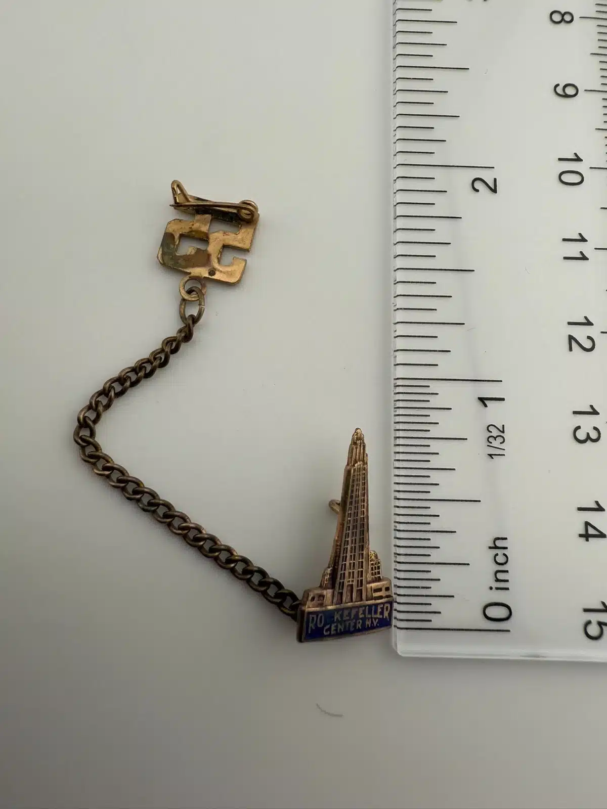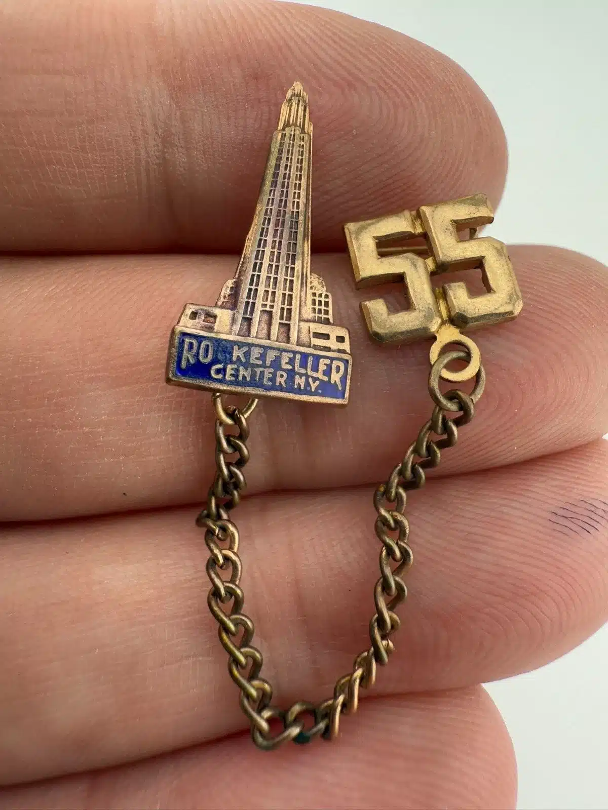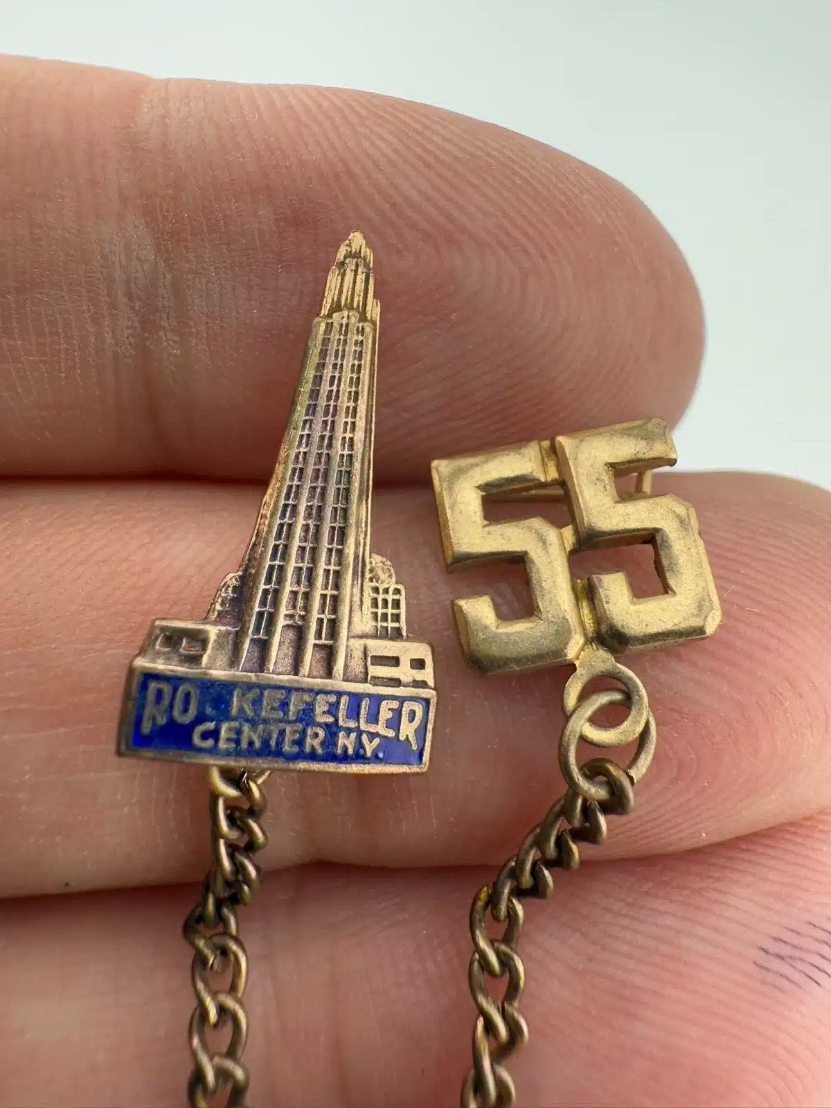 Vintage 1955 Rockefeller Center Double Lapel Pin Brooch With Chain