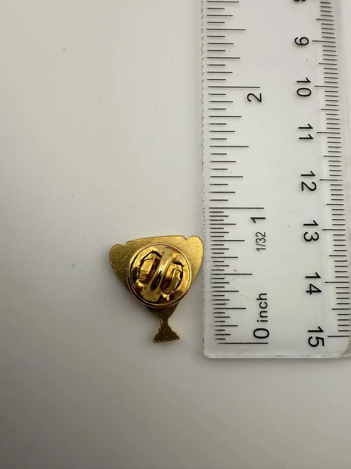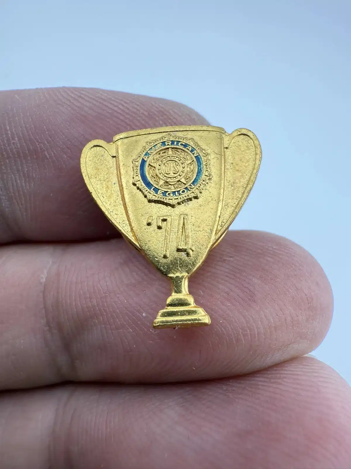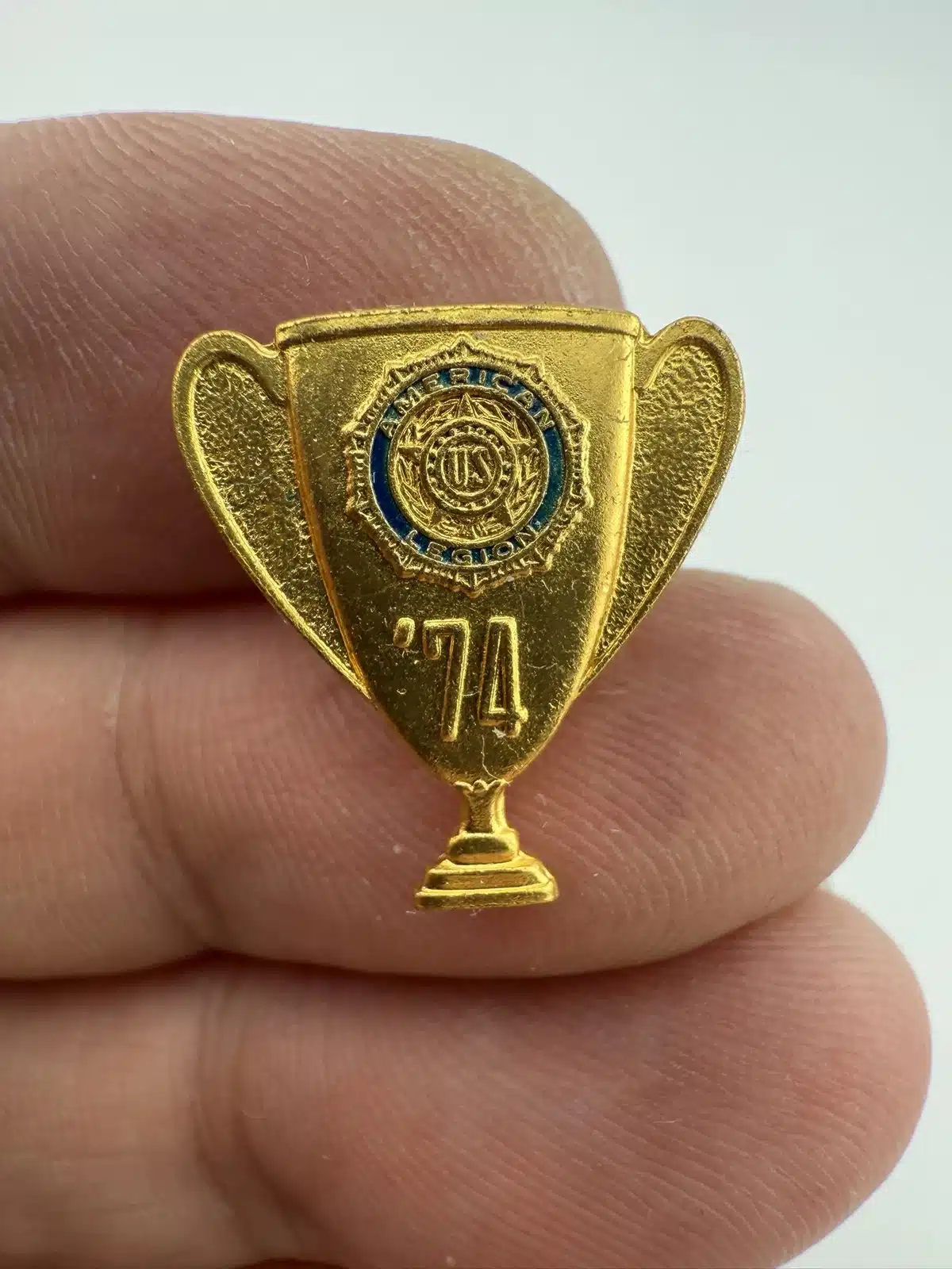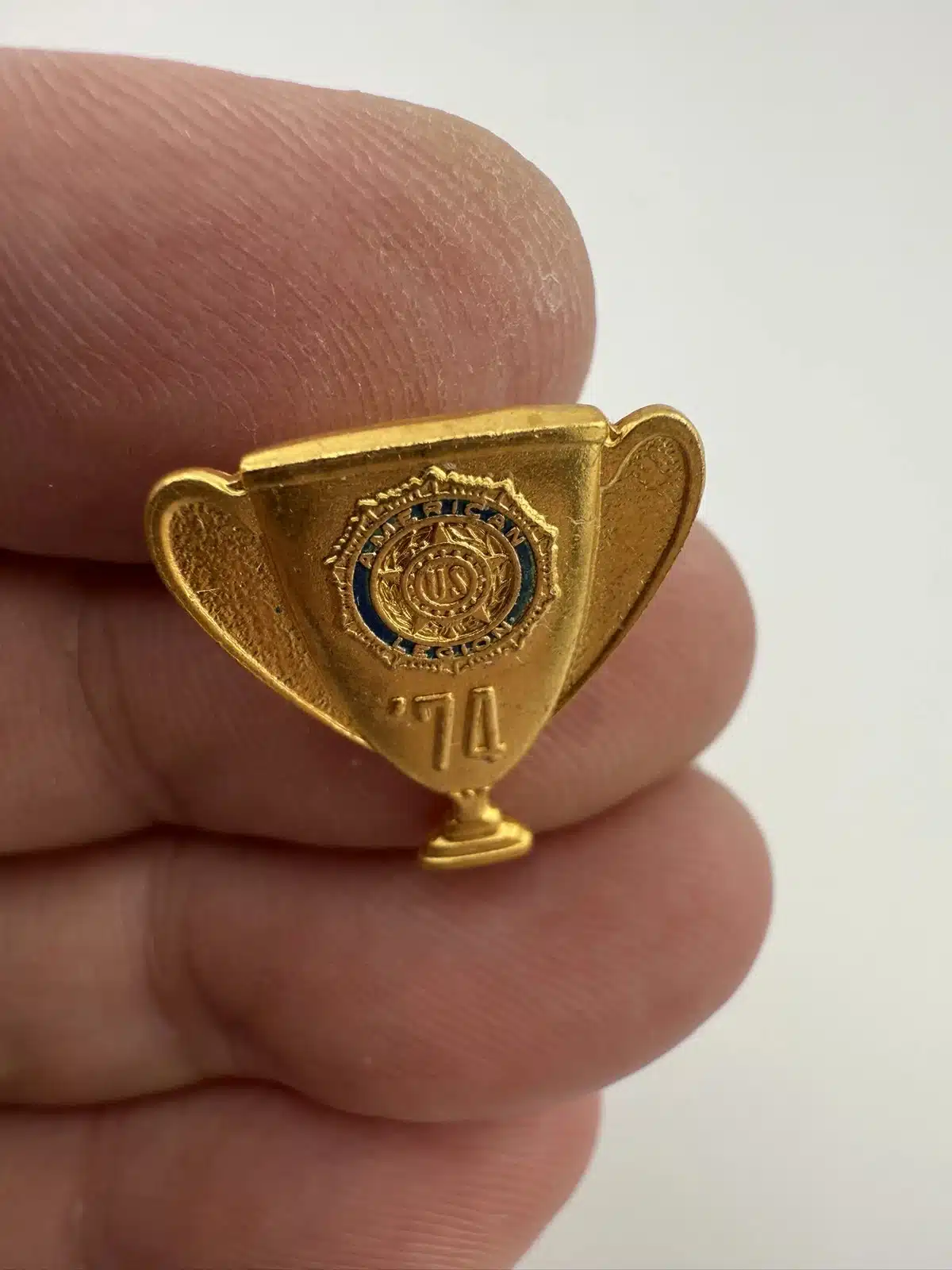 Unique pin in the shape of a trophy with the American Legion logo and ’74 below. Gold toned.