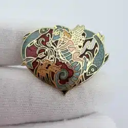 This vintage 1983 Krewe of Proteus Mardi Gras favor pin features vibrant colors and intricate designs that reflect the festive spirit of New Orleans’ Mardi Gras celebration. The pin showcases the Krewe’s iconic imagery, celebrating its long-standing tradition since its founding in 1882. Within the pin you will discover a cherub angel shooting an arrow, a fish on each side, as well as a seahorse in the center behind the angel.