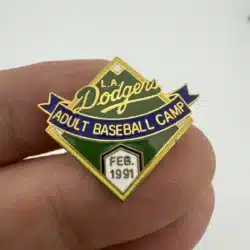 This extremely rare baseball diamond pin commemorates the February 1991 Los Angeles Dodgers Adult Baseball Camp, an immersive experience where attendees practiced and played alongside retired professional players. The Dodgers first launched the camp in 1983, making this event part of its early history. The camp was likely held at Dodgertown in Vero Beach, Florida.