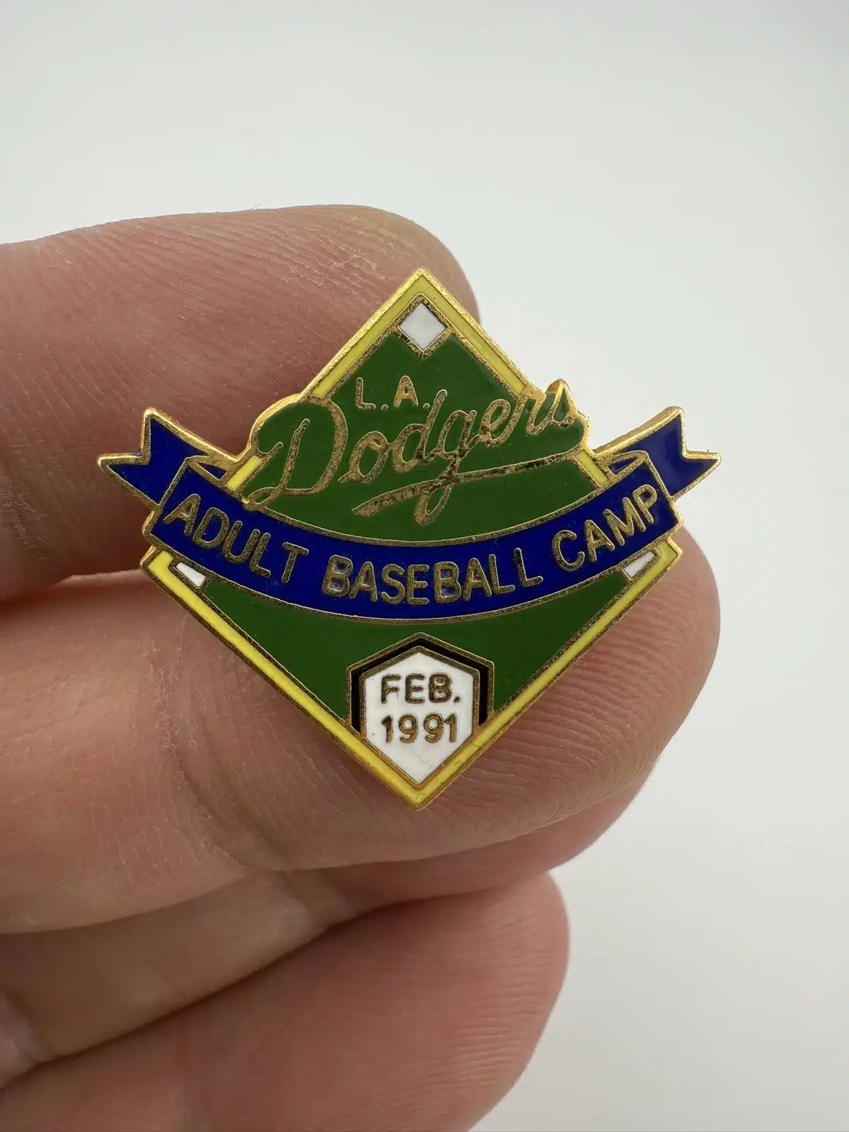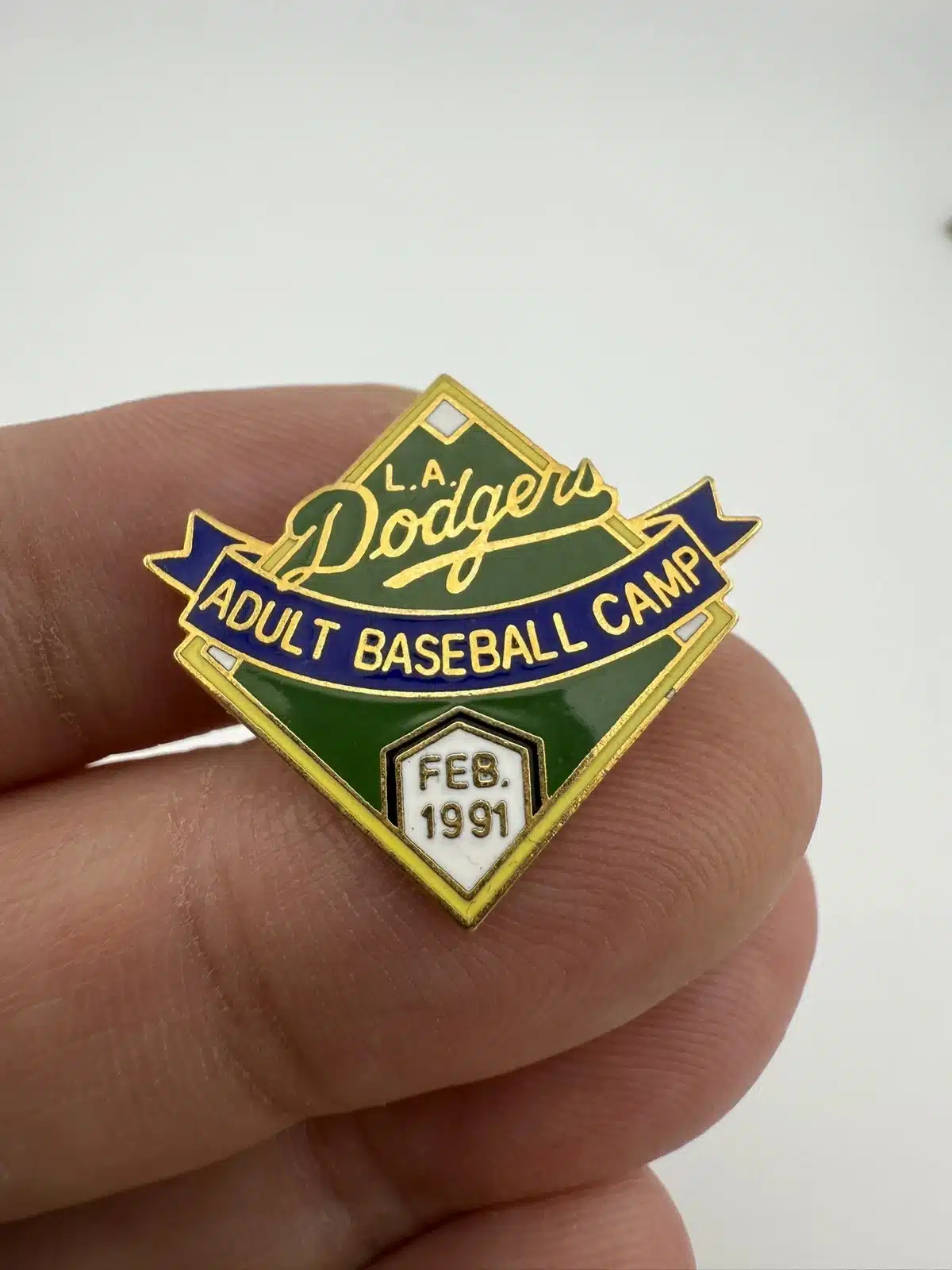 This extremely rare baseball diamond pin commemorates the February 1991 Los Angeles Dodgers Adult Baseball Camp, an immersive experience where attendees practiced and played alongside retired professional players. The Dodgers first launched the camp in 1983, making this event part of its early history. The camp was likely held at Dodgertown in Vero Beach, Florida.