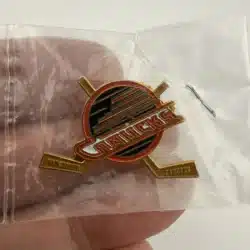 This vintage 1991 Vancouver Canucks pin features the retro skate logo, a symbol of the team’s identity during the mid 1980s to late 1990s. The design captures the essence of the Canucks’ vibrant colors and hockey heritage, making it a notable piece for collectors of vintage hockey memorabilia.
