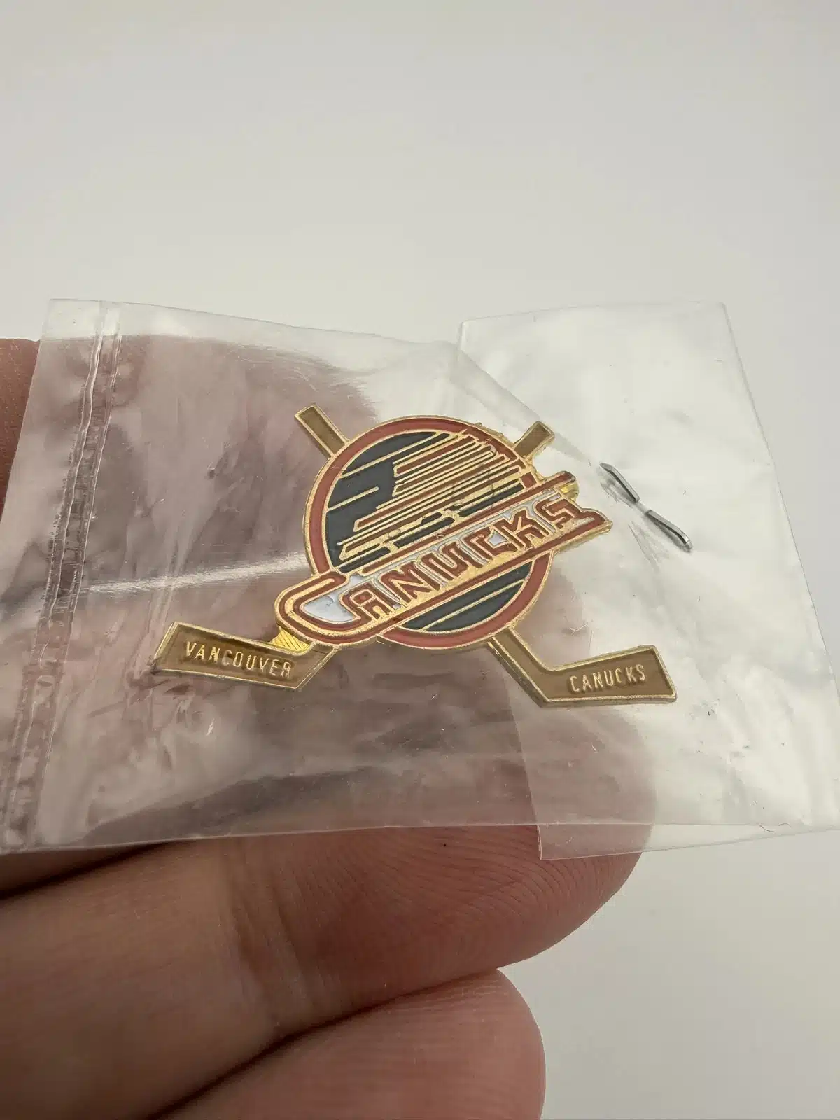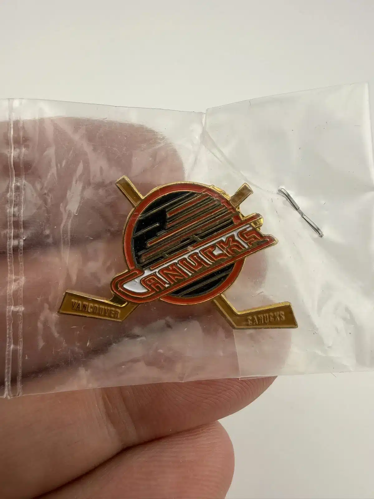 This vintage 1991 Vancouver Canucks pin features the retro skate logo, a symbol of the team’s identity during the mid 1980s to late 1990s. The design captures the essence of the Canucks’ vibrant colors and hockey heritage, making it a notable piece for collectors of vintage hockey memorabilia.