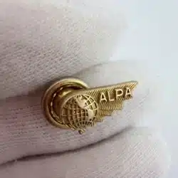 This vintage pin features the emblem of the Air Line Pilots Association (ALPA), founded in 1931 to advocate for pilots’ rights, fair labor practices, and aviation safety. The design showcases a globe at the left, symbolizing the global reach of commercial aviation, with a stylized wing extending to the right. Raised lettering spelling out ALPA is set across the wing, giving the piece added dimension and crisp visual detail.