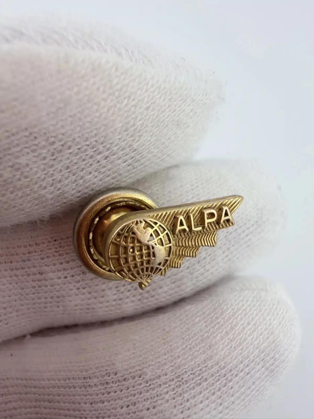 This vintage pin features the emblem of the Air Line Pilots Association (ALPA), founded in 1931 to advocate for pilots’ rights, fair labor practices, and aviation safety. The design showcases a globe at the left, symbolizing the global reach of commercial aviation, with a stylized wing extending to the right. Raised lettering spelling out ALPA is set across the wing, giving the piece added dimension and crisp visual detail.