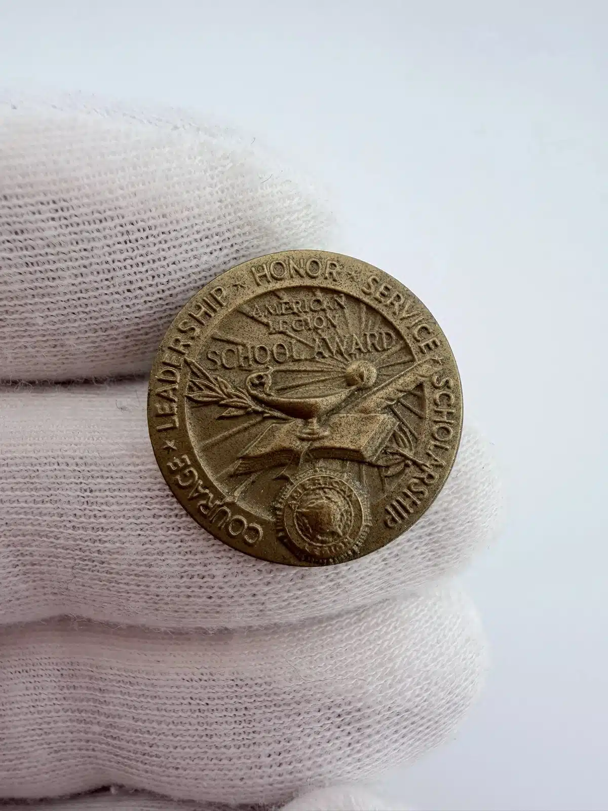 This vintage American Legion School Award pin features a circular design with the words “Courage Leadership Service and Scholarship” around the outer edge. At the center is an academic-themed arrangement including an open book, an oil lamp, and a writing feather with the text “American Legion School Award” above and the American Legion emblem positioned below.