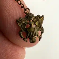 A vintage Amico US Army eagle insignia pin on chain, featuring a classic design representative of military service.