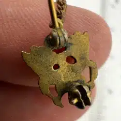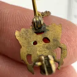 Condition: Used with marks, dings, wear, age, and build up. Pin on the right has damage around the blue half circle in the dark area (looks liked cracked enamel). Unknown alloys on both pins + chain, unknown blue stone or color on the right pin. Appears to have the AMICO eagle logo on rear of left pin, nothing on right. Clasps are functional and tested, but not perfectly aligned / bent.