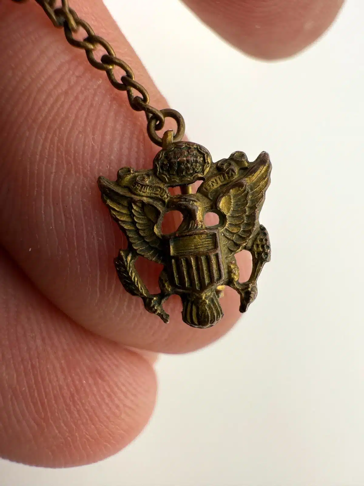 A vintage Amico US Army eagle insignia pin on chain, featuring a classic design representative of military service.