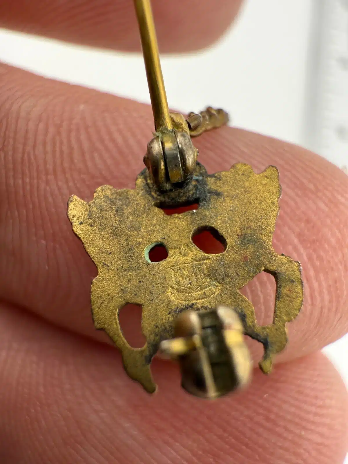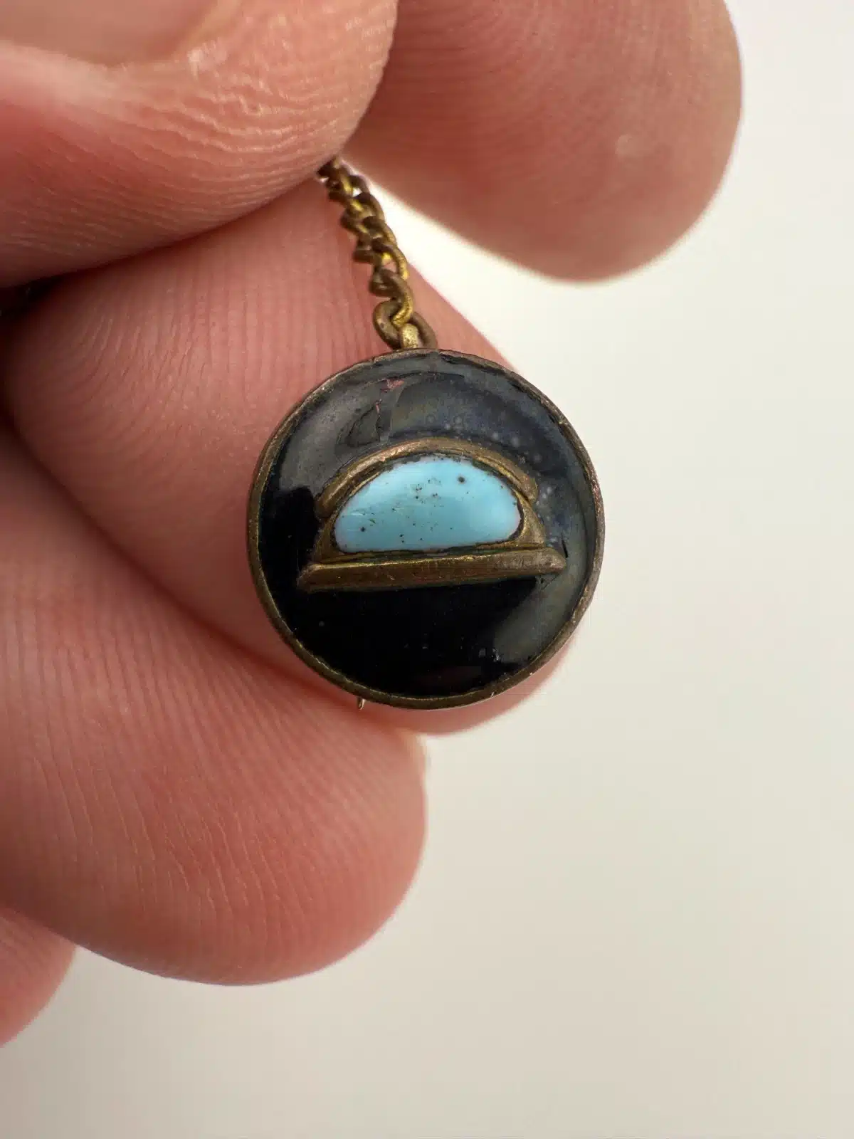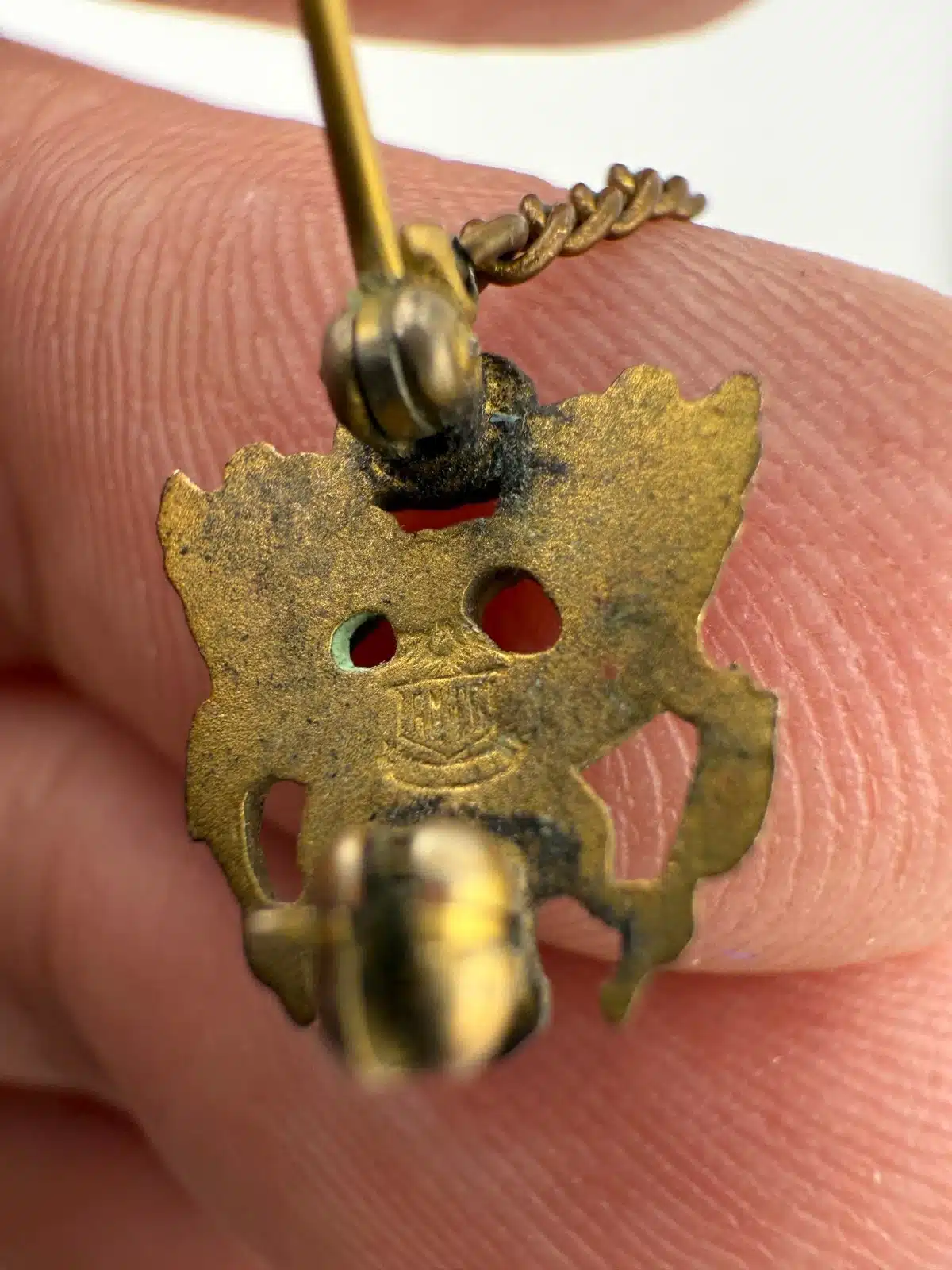 Condition: Used with marks, dings, wear, age, and build up. Pin on the right has damage around the blue half circle in the dark area (looks liked cracked enamel). Unknown alloys on both pins + chain, unknown blue stone or color on the right pin. Appears to have the AMICO eagle logo on rear of left pin, nothing on right. Clasps are functional and tested, but not perfectly aligned / bent.