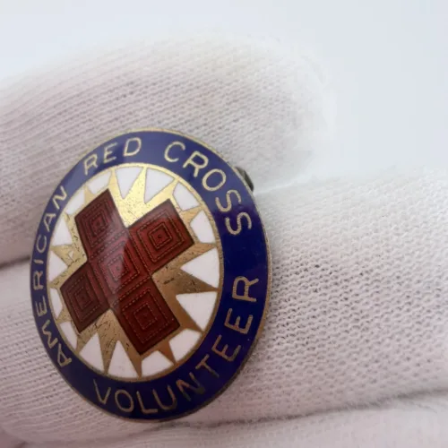The American Red Cross has long issued volunteer pins to recognize service and participation, with designs often incorporating the red cross emblem and star motifs. The piece is made of sterling silver and is marked W on the reverse.