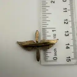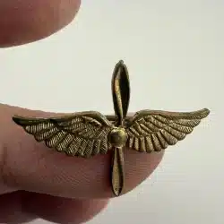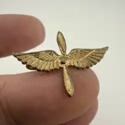 A vintage Army Air Corps pilot wings showcasing the iconic propeller and wings design associated with aviators of the era. Possibly WW2. Unknown alloy and possibly repaired – tough to tell.