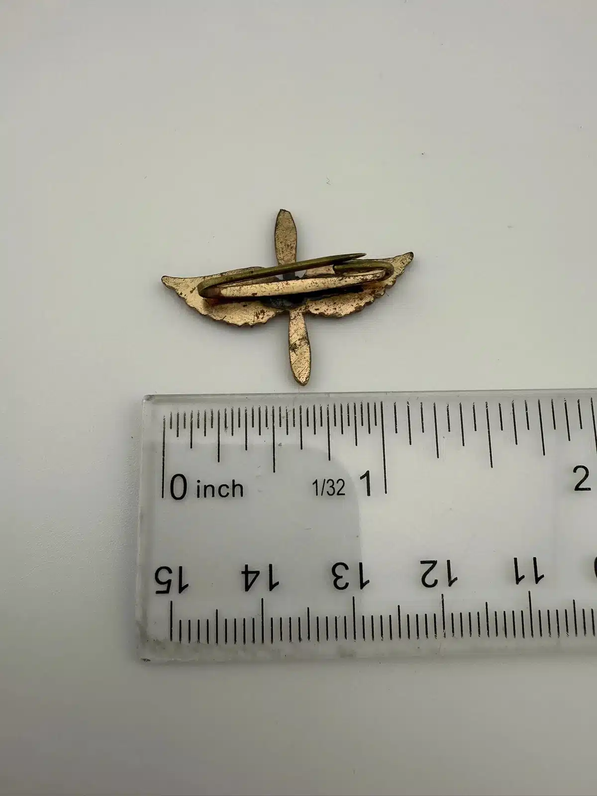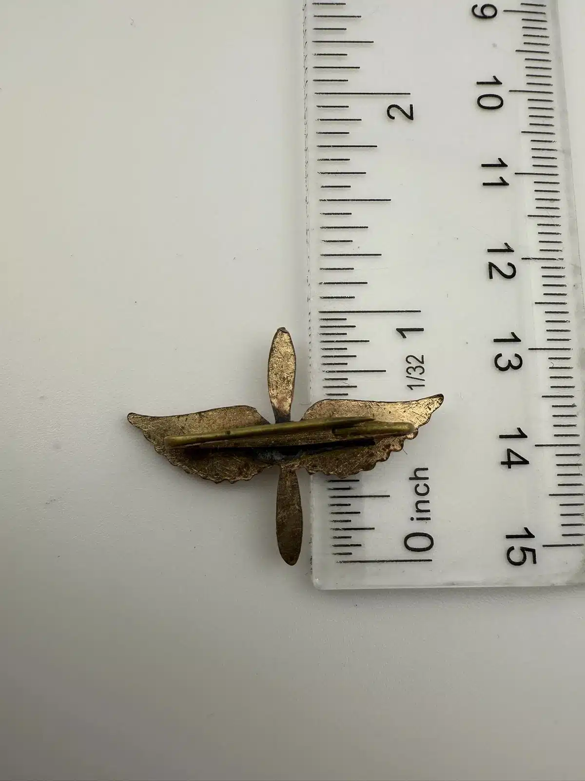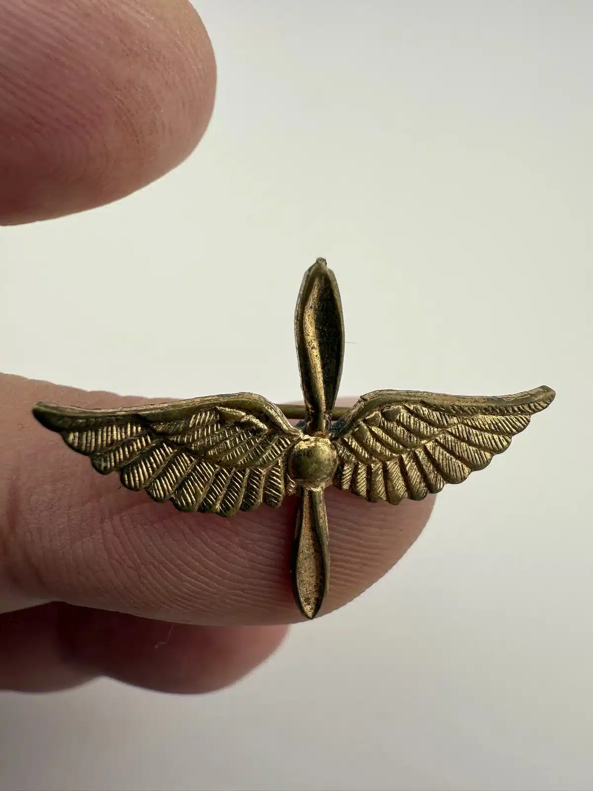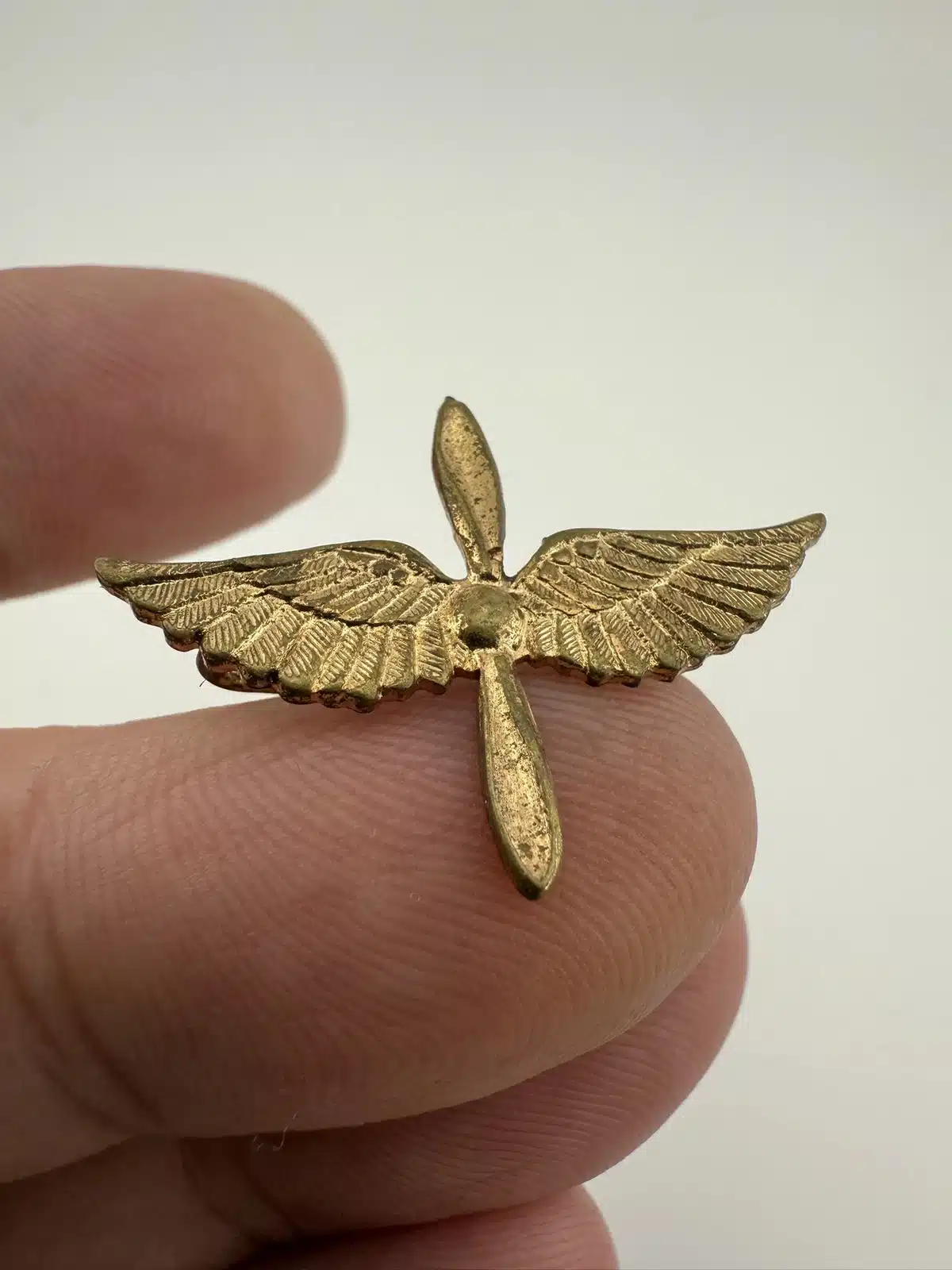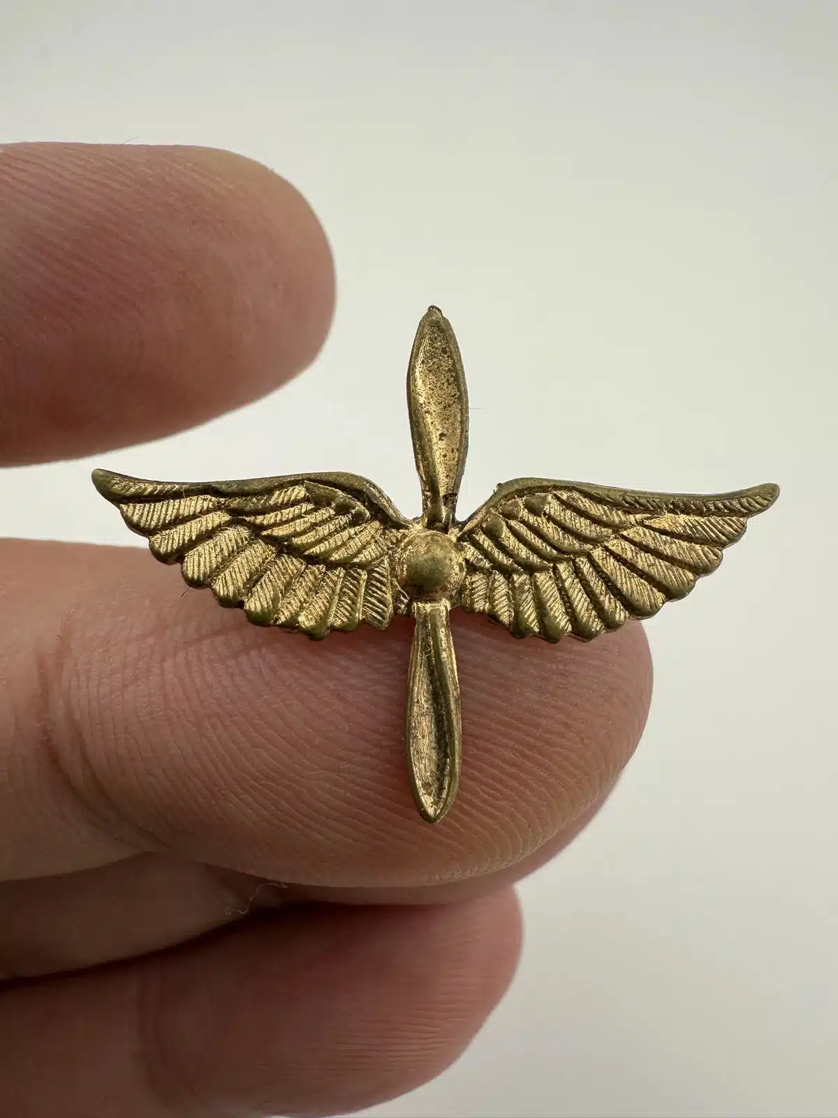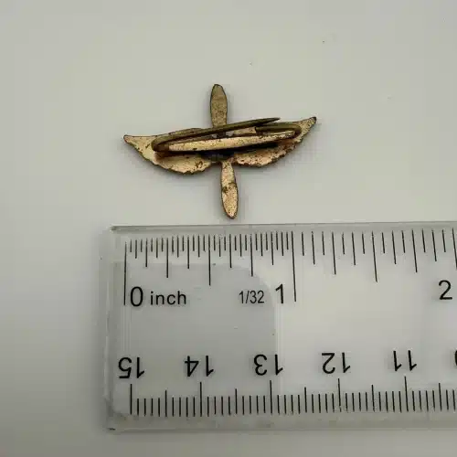 A vintage Army Air Corps pilot wings showcasing the iconic propeller and wings design associated with aviators of the era. Possibly WW2. Unknown alloy and possibly repaired – tough to tell.
