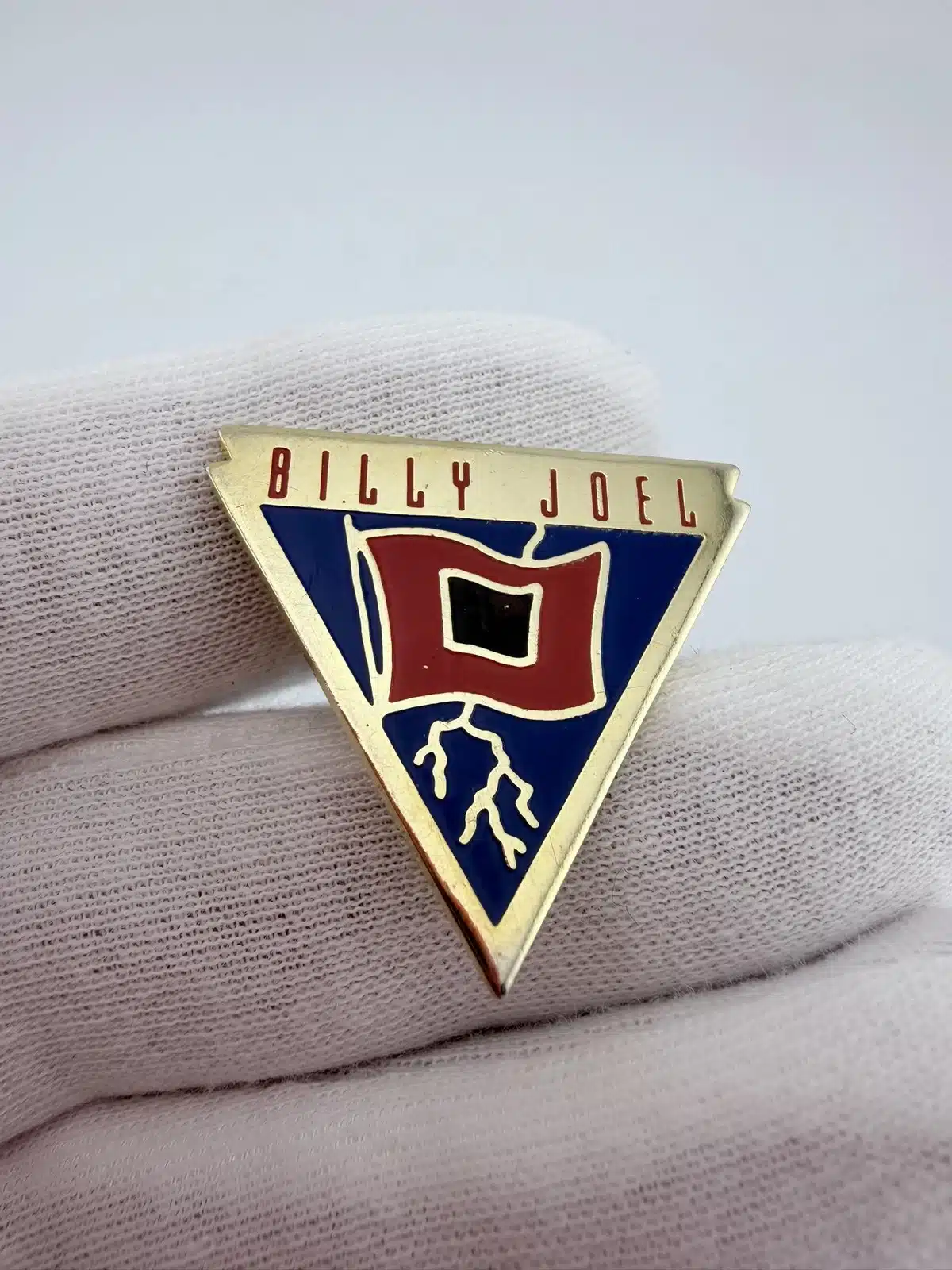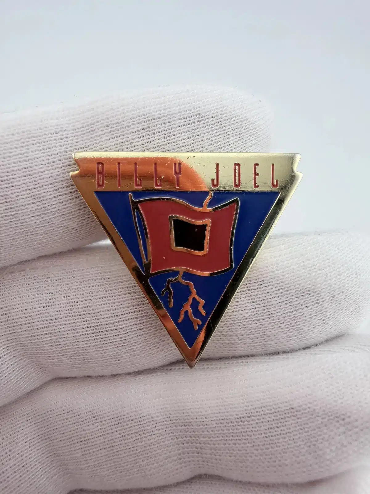 This triangular pin features the text Billy Joel at the top above a red flag with a black square design, a storm flag, with lightning shown behind the flag. The bold color contrast and angled shape give it a striking, album-inspired appearance.