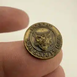 This older Bobcat Cub Scouts B.S.A. pin showcases a detailed bobcat face at the center with the organization name wrapped around the design. It predates the more common square or diamond-shaped versions, making it a neat early variation of the classic Cub Scout emblem.