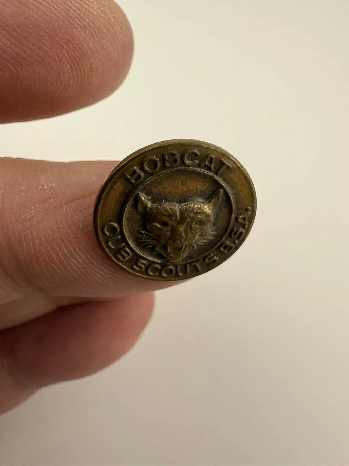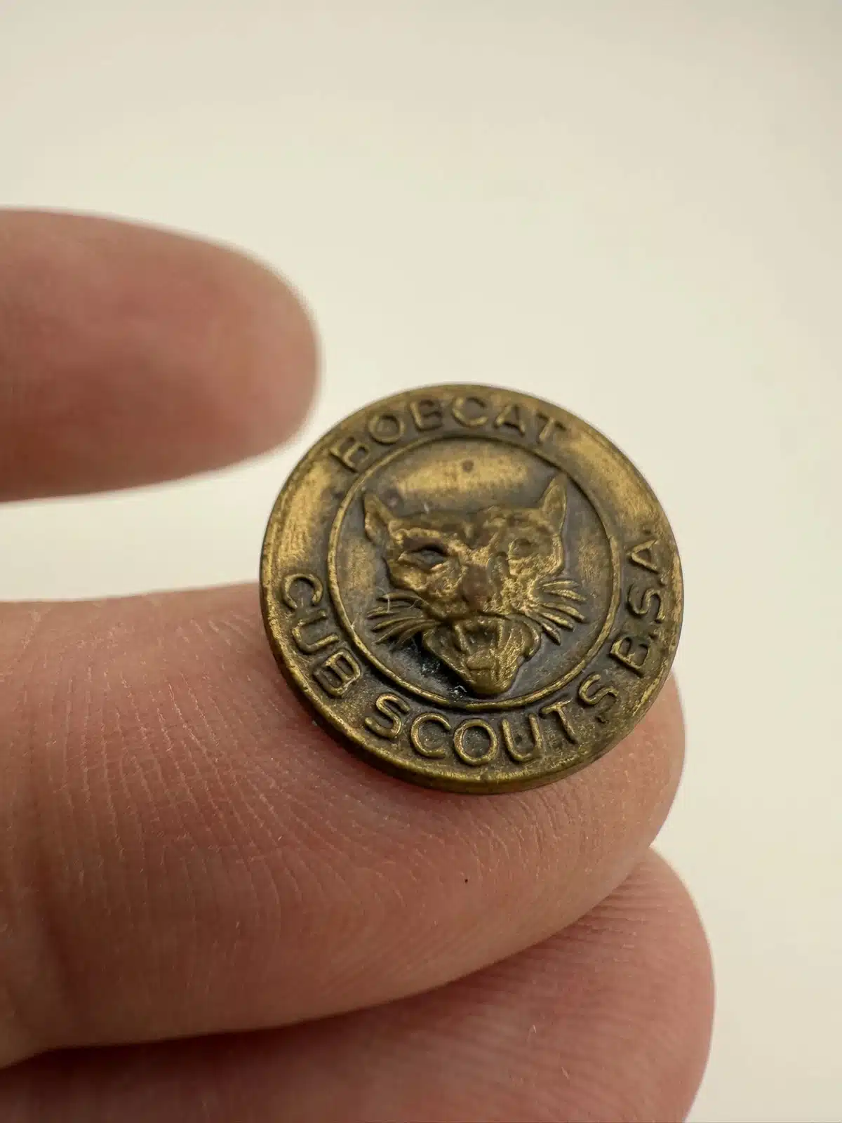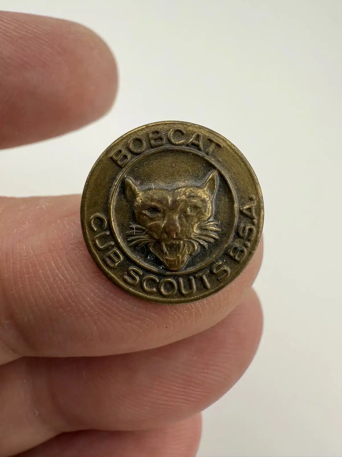 This older Bobcat Cub Scouts B.S.A. pin showcases a detailed bobcat face at the center with the organization name wrapped around the design. It predates the more common square or diamond-shaped versions, making it a neat early variation of the classic Cub Scout emblem.