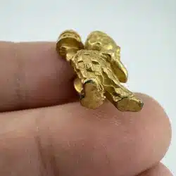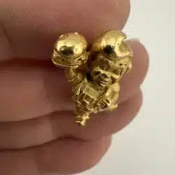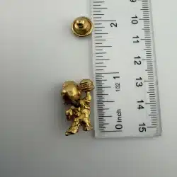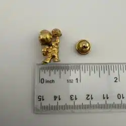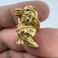 A vintage gold tone lapel pin featuring the iconic Bob’s Big Boy restaurant mascot. This collectible piece represents a nostalgic era of American dining, showcasing the beloved character in a charming design that is rather detailed.