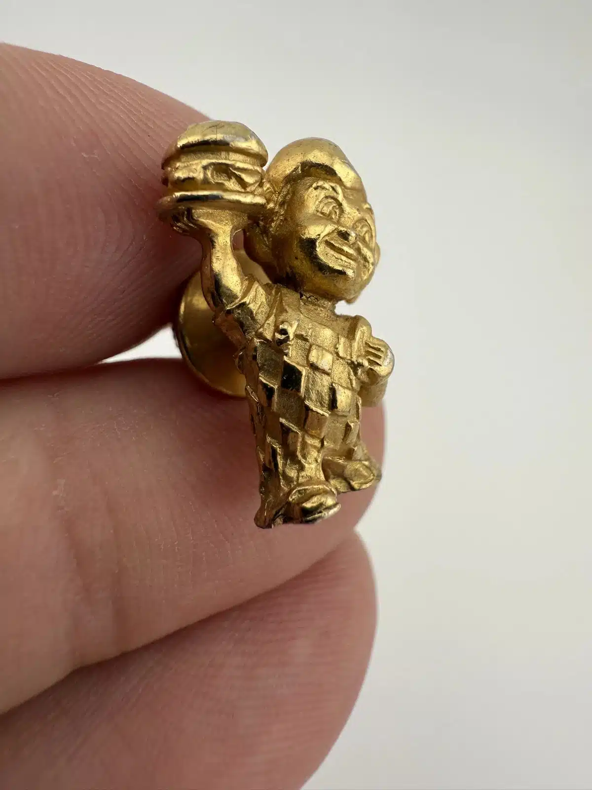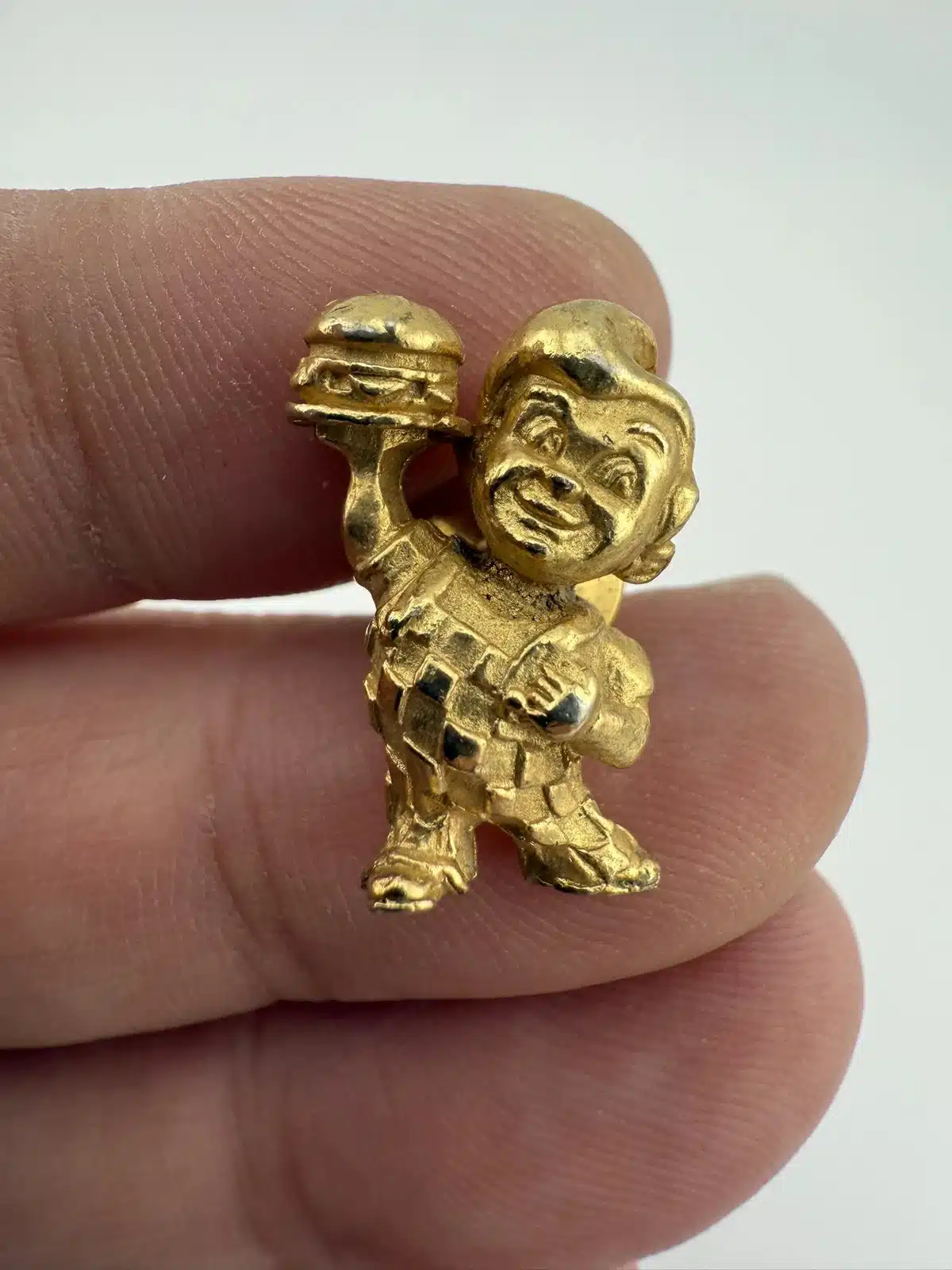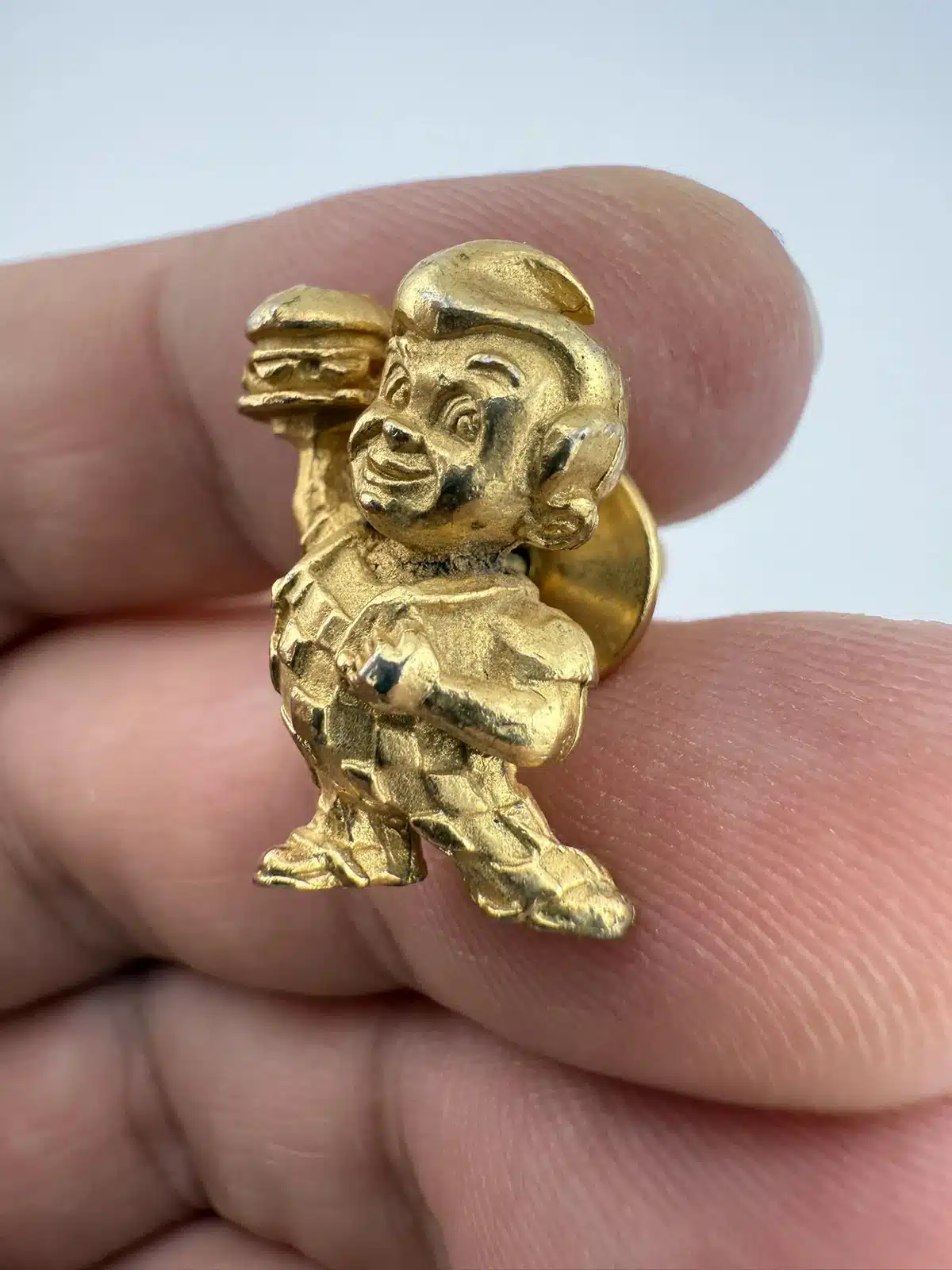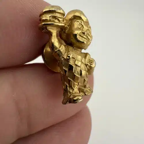 A vintage gold tone lapel pin featuring the iconic Bob’s Big Boy restaurant mascot. This collectible piece represents a nostalgic era of American dining, showcasing the beloved character in a charming design that is rather detailed.