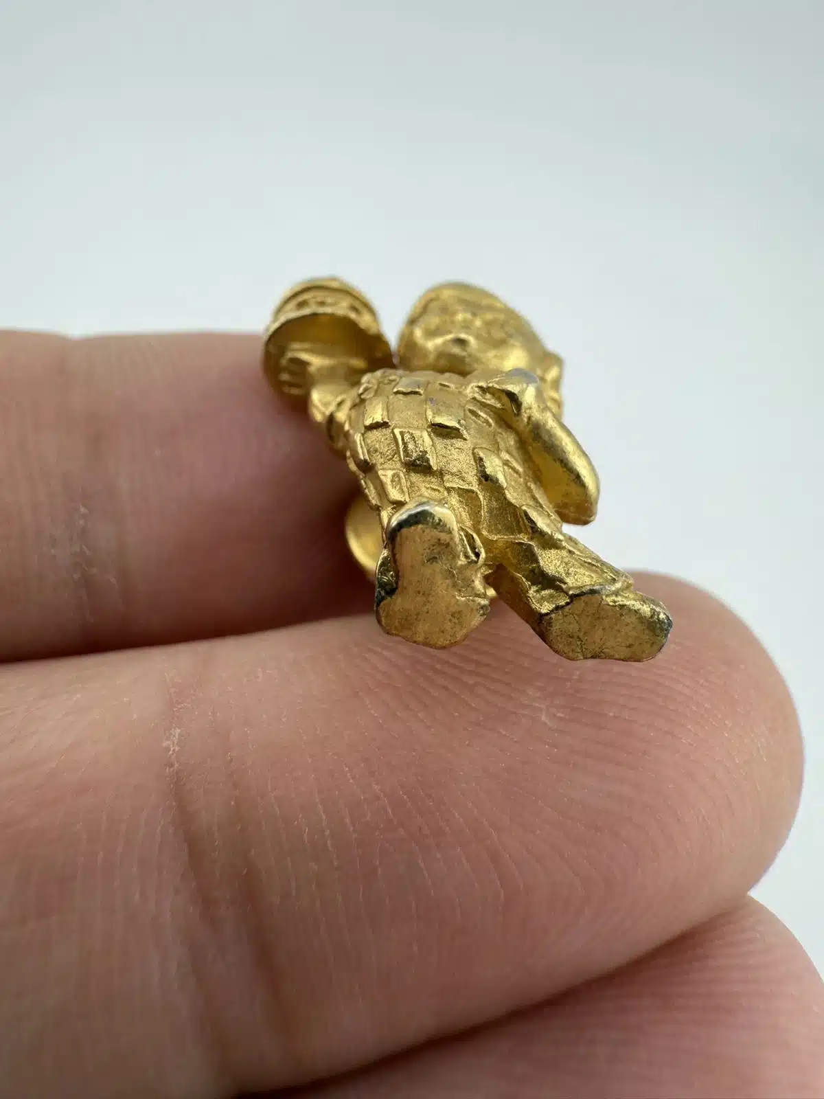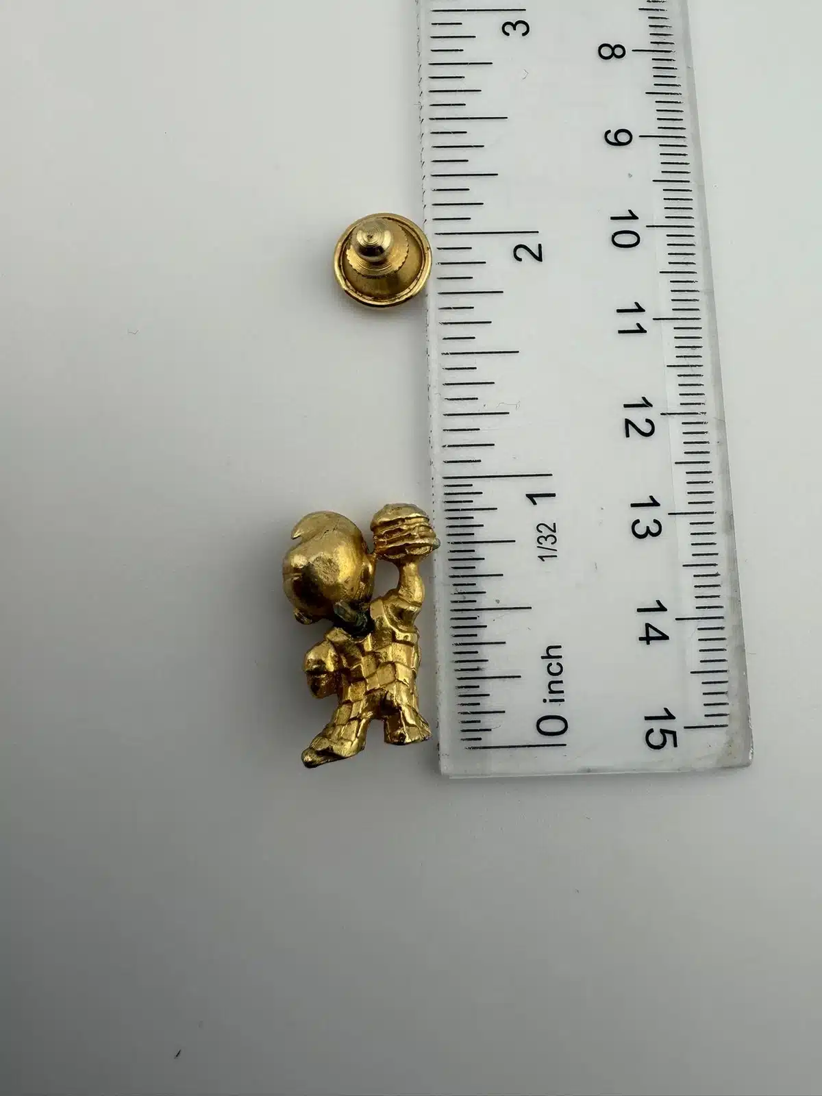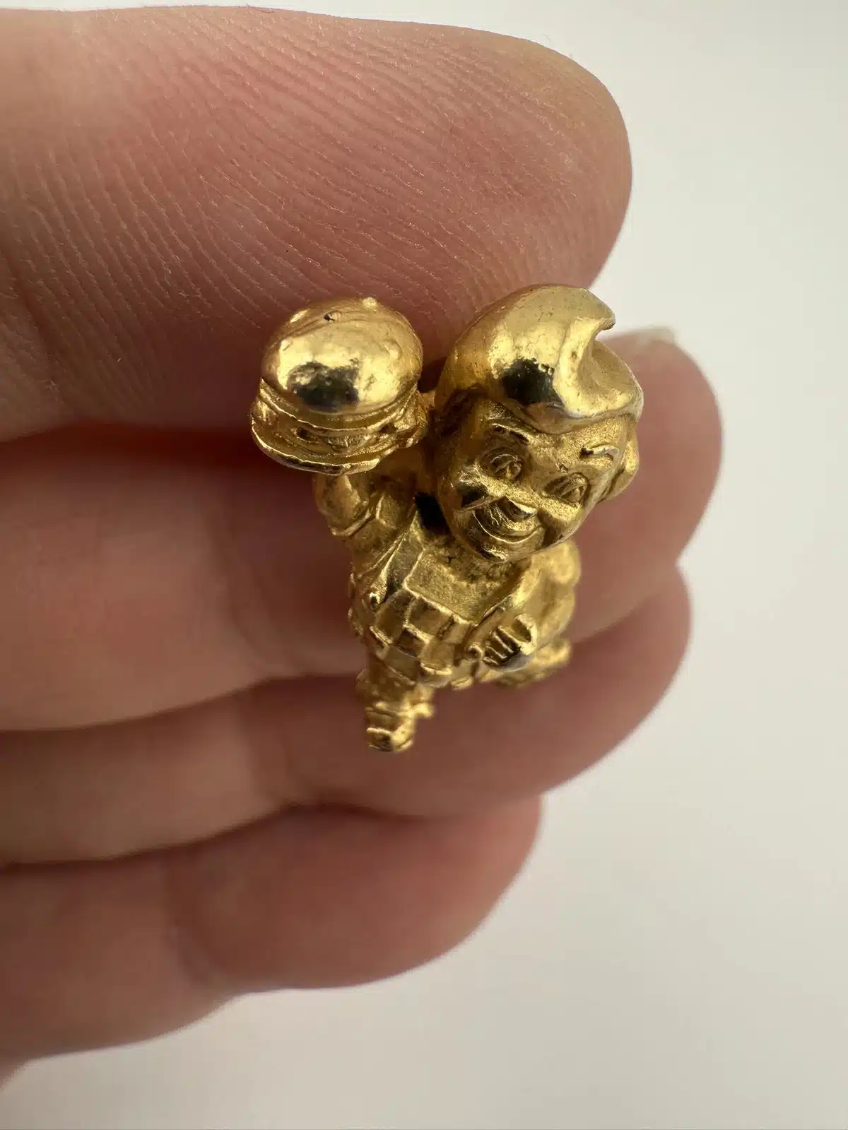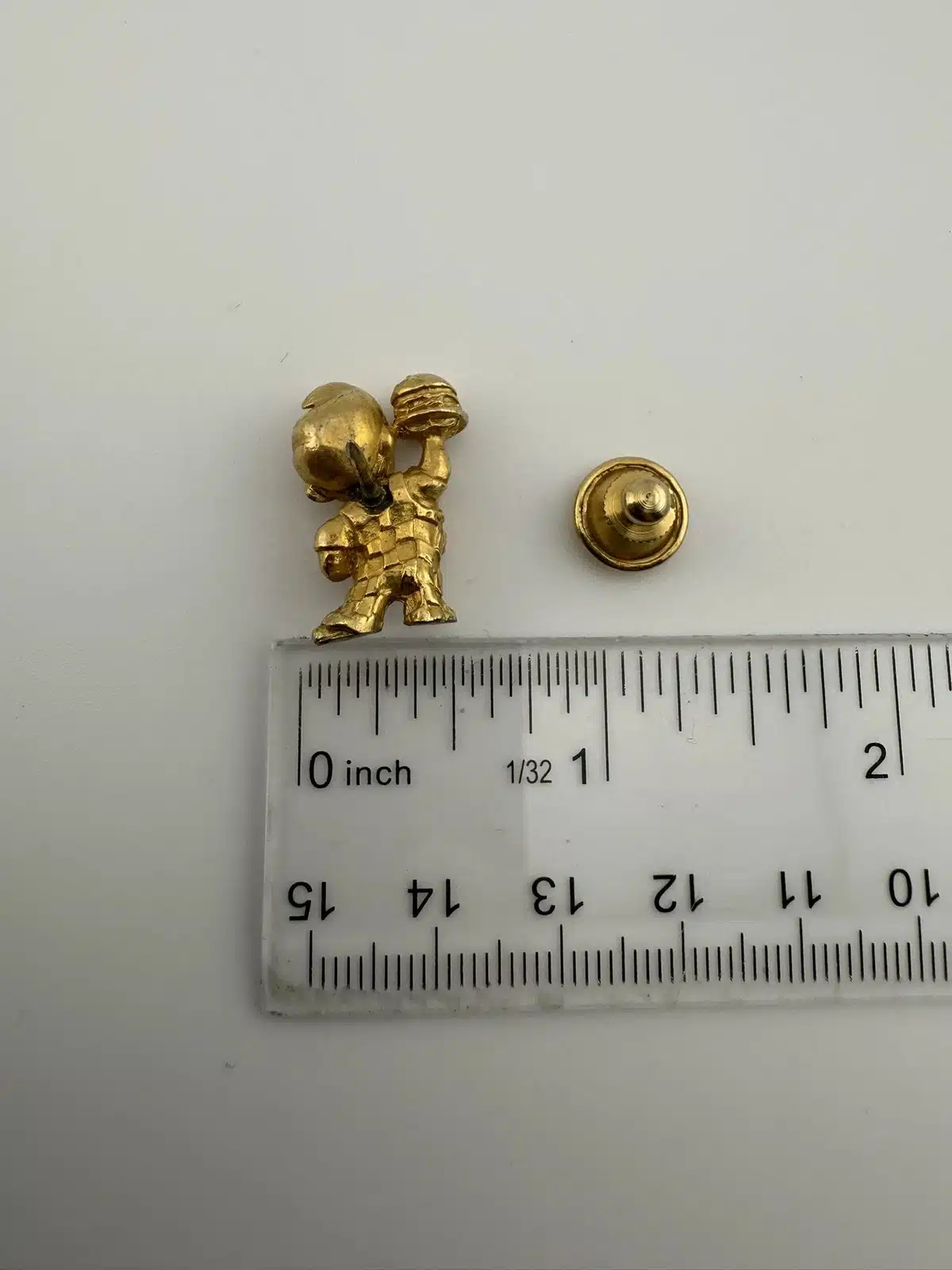 A vintage gold tone lapel pin featuring the iconic Bob’s Big Boy restaurant mascot. This collectible piece represents a nostalgic era of American dining, showcasing the beloved character in a charming design that is rather detailed.