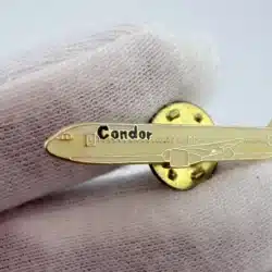 This vintage Condor Airlines lapel pin features an airplane-shaped design finished in white and yellow. The word “Condor” appears along the side of the fuselage, while the airline’s logo is displayed on the rear tail wing.