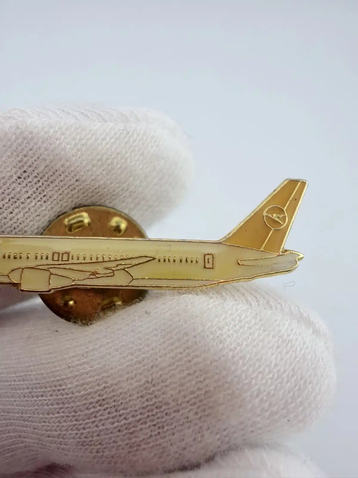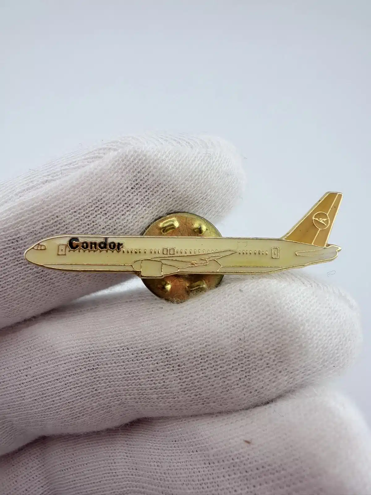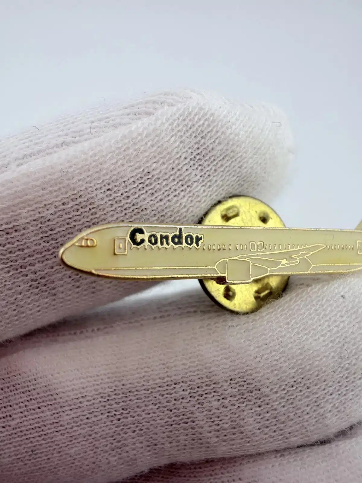This vintage Condor Airlines lapel pin features an airplane-shaped design finished in white and yellow. The word “Condor” appears along the side of the fuselage, while the airline’s logo is displayed on the rear tail wing.