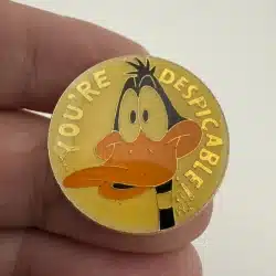 This vintage lapel pin features Daffy Duck in a playful pose, accompanied by the phrase ‘You’re Despicable’ in bold lettering, capturing the character’s iconic personality. Produced by Gift Creations in 1990, this pin reflects the enduring popularity of Warner Bros.’ animated characters from the Golden Age of Animation.