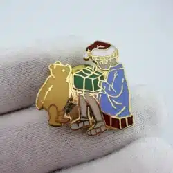 This vintage Disney Winnie the Pooh and Christopher Robin pin features a charming scene of Winnie the Pooh standing beside Christopher Robin as he opens a present while wearing a red and white Santa hat. The festive design captures the classic characters from A. A. Milne’s beloved stories as popularized by Disney adaptations.